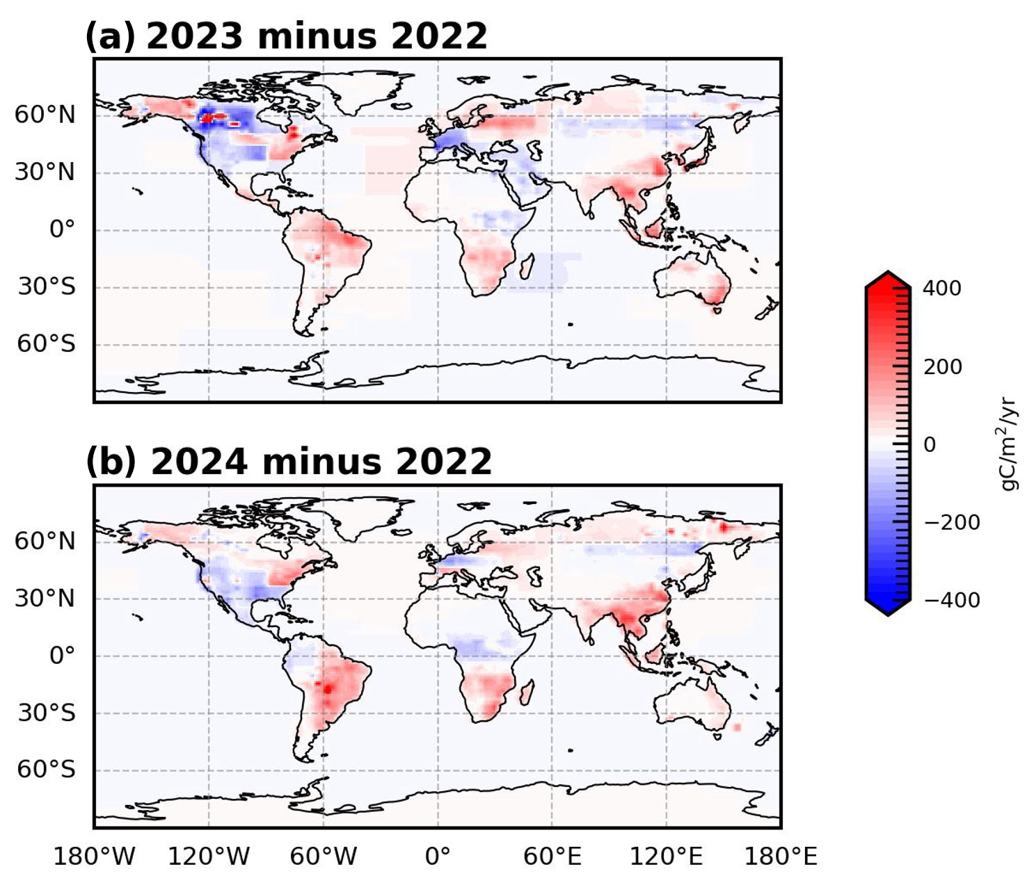 Figure C1Changes in annual mean a posteriori NBE flux estimates from our control inversion between (a) 2022 and 2023 and between (b) 2022 and 2024.