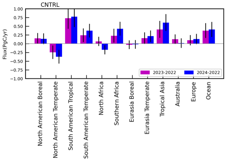 We extend our control inversion experiment to the end of 2024. Figure C1 shows the difference of a posteriori NBE CO2 flux estimates between 2024 and our baseline year of 2022 alongside the difference between 2023 and 2022. Figure C2 shows the same data but broken down into TransCom-3 regions. We find that tropical land absorbed less carbon in 2024 than during 2022, primarily over South America, Africa, and (to a lesser extent) Southeast Asia.