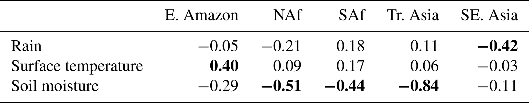 Table A1Normalized linear-fitting coefficients for the independent variables of the MERRA2 rain, surface temperature, and soil moisture used to fit the NBE anomalies (Fig. 5) for the regions defined in Fig. 3a, 2014–2023, inclusively. The largest coefficient for each region is highlighted in bold.