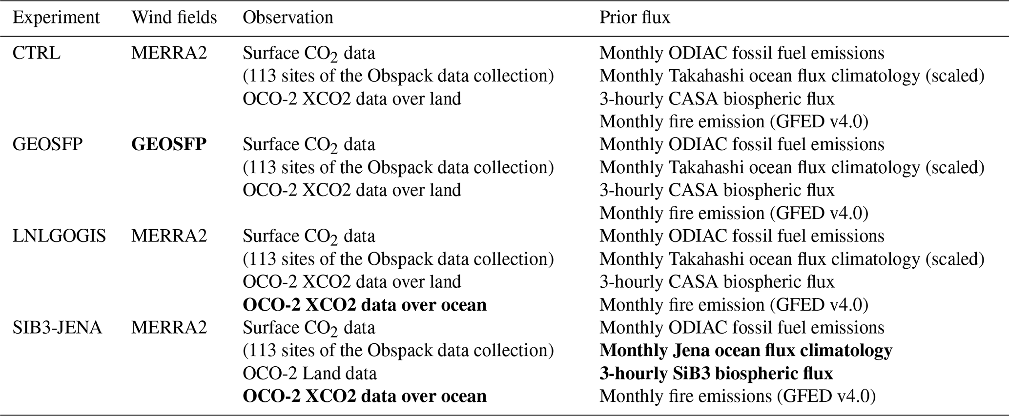 The GEOSFP inversion is driven by GMAO Goddard Earth Observing System Forward Processing (GEOS-FP) meteorological analyses, based on a convection scheme that is different from the one used in the MERRA2 reanalysis, which we use in our control experiment (CNTRL). For the inversion using OCO-2 land nadir, land glint, and ocean glint data, and in situ data (LNLGOGIS) inversion, we use additional OCO-2 XCO2 sun-glint retrievals collected over the oceans. The SIB3-JENA inversion includes alternative a priori estimates for sea–air CO2 fluxes based on CO2 observations (Rödenbeck et al., 2022) and for biosphere–atmosphere fluxes from the SiB3 model simulation (Baker et al., 2009).