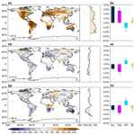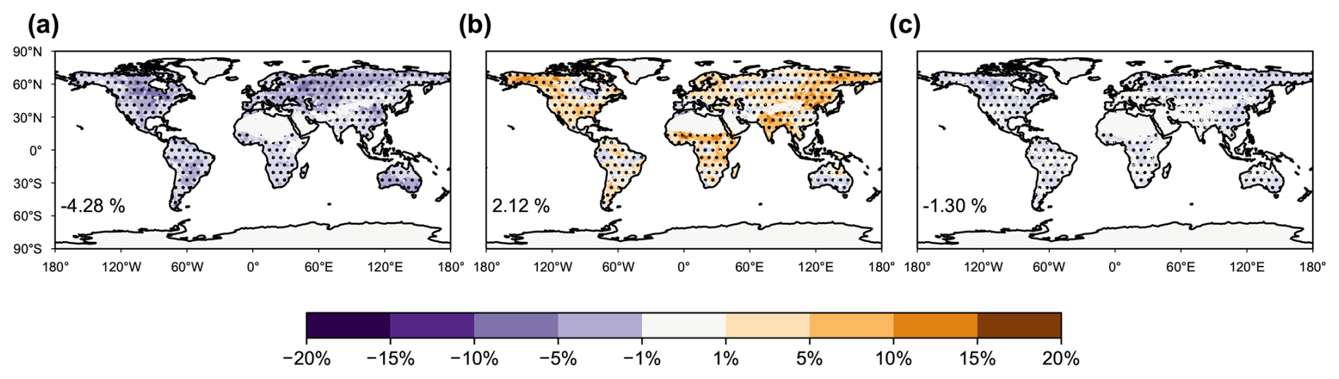 Figure 7The same as Fig. 6 but GLENS is applied. Results shown are the changes in frequency of drought extremes (scPDSI <4) under SAI scenarios relative to RCP8.5 at 2075–2094 attributable to (a) temperature, (b) precipitation, and (c) radiation changes.