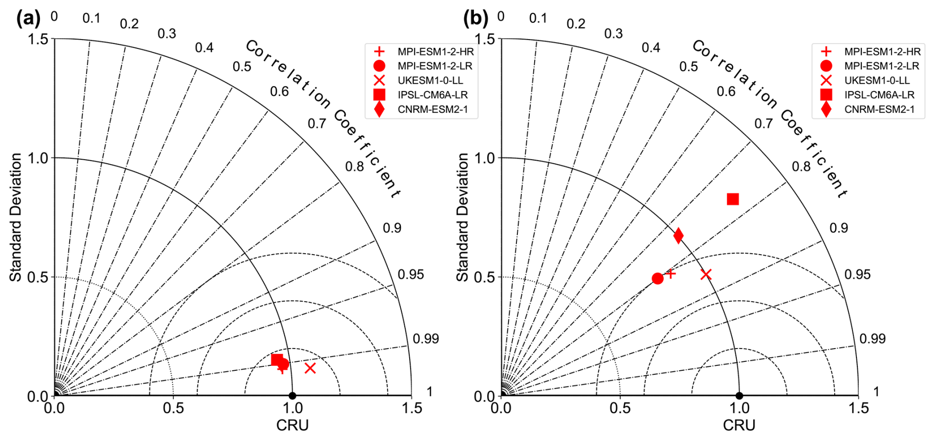 Monthly precipitation and temperature from the CRU TS (Climate Research Unit Gridded Time Series) dataset version 4.07 are used to evaluate the model's performance in reproducing present-day climate (Harris et al., 2020). Both the CRU data and model output are interpolated to 1° × 1°. We calculate the correlation coefficient (R, 1 is best), standard deviation ratio (SDEV, 1 is best), and centered root-mean-square error (CRMSE, 0 is best) between the CRU data and model simulations (Taylor, 2001). For temperature, all models reproduce the observed spatial pattern with R> 0.98 and SDEV ranging from 0.95 to 1.08 (Fig. 1a). The CRMSE for most models is less than 2, except for IPSL-CM6A-LR (2.24). For precipitation, R ranges from 0.74 to 0.85, SDEV ranges from 0.82 to 1, and CRMSE ranges from 0.99 to 1.55 (Fig. 1b). Although the R for simulated precipitation is lower than that for temperature, the CRMSE is generally lower. Overall, the selected models reasonably reproduce the observed meteorology with low biases. While all models accurately capture the changing characteristics of temperature and precipitation, differences in parameterization schemes for radiation, cloud-aerosol interactions, aerosol microphysics, and other factors result in variations in the simulated patterns of meteorological factors (Mauritsen et al., 2019; Visioni et al., 2021). Therefore, we use the multi-model ensemble to minimize biases caused by inter-model variations.