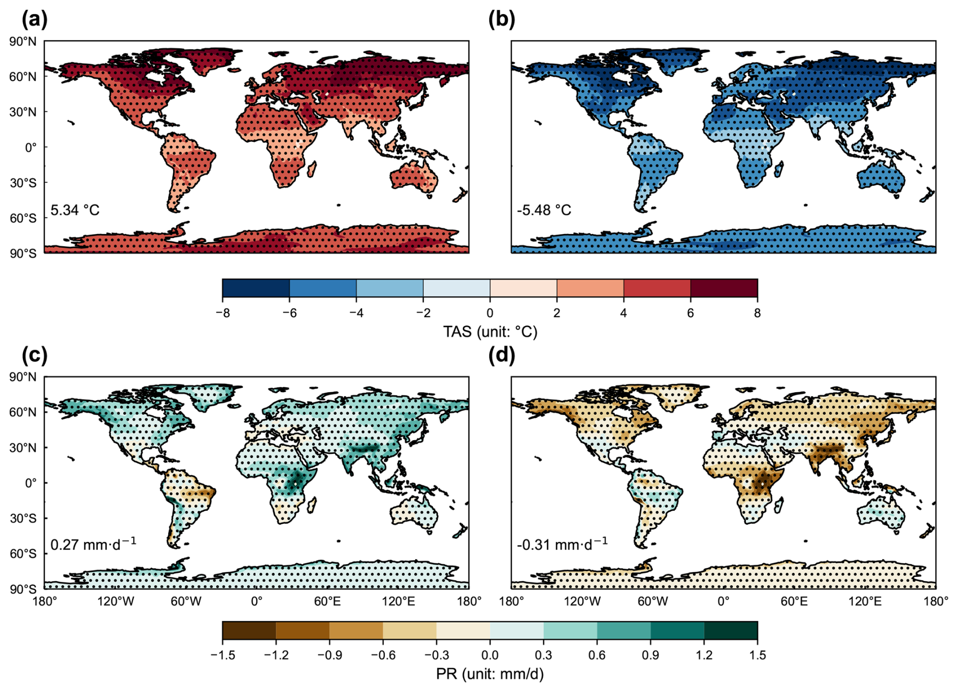 Figure 3Climatic responses to global warming and SAI in GLENS. Results shown are the spatial pattern of annual mean changes in (a, b) temperature (TAS) and (c, d) precipitation (PR) at 2075–2094 under (a, c) RCP8.5 scenario relative to 2010–2030 baseline, as well as that under (b, d) SAI scenarios relative to RCP8.5 at 2075–2094. The dotted areas indicate regions where at least two out of three members show changes with the same signs. The mean value of the difference over global land surface is shown at the lower left of each panel.