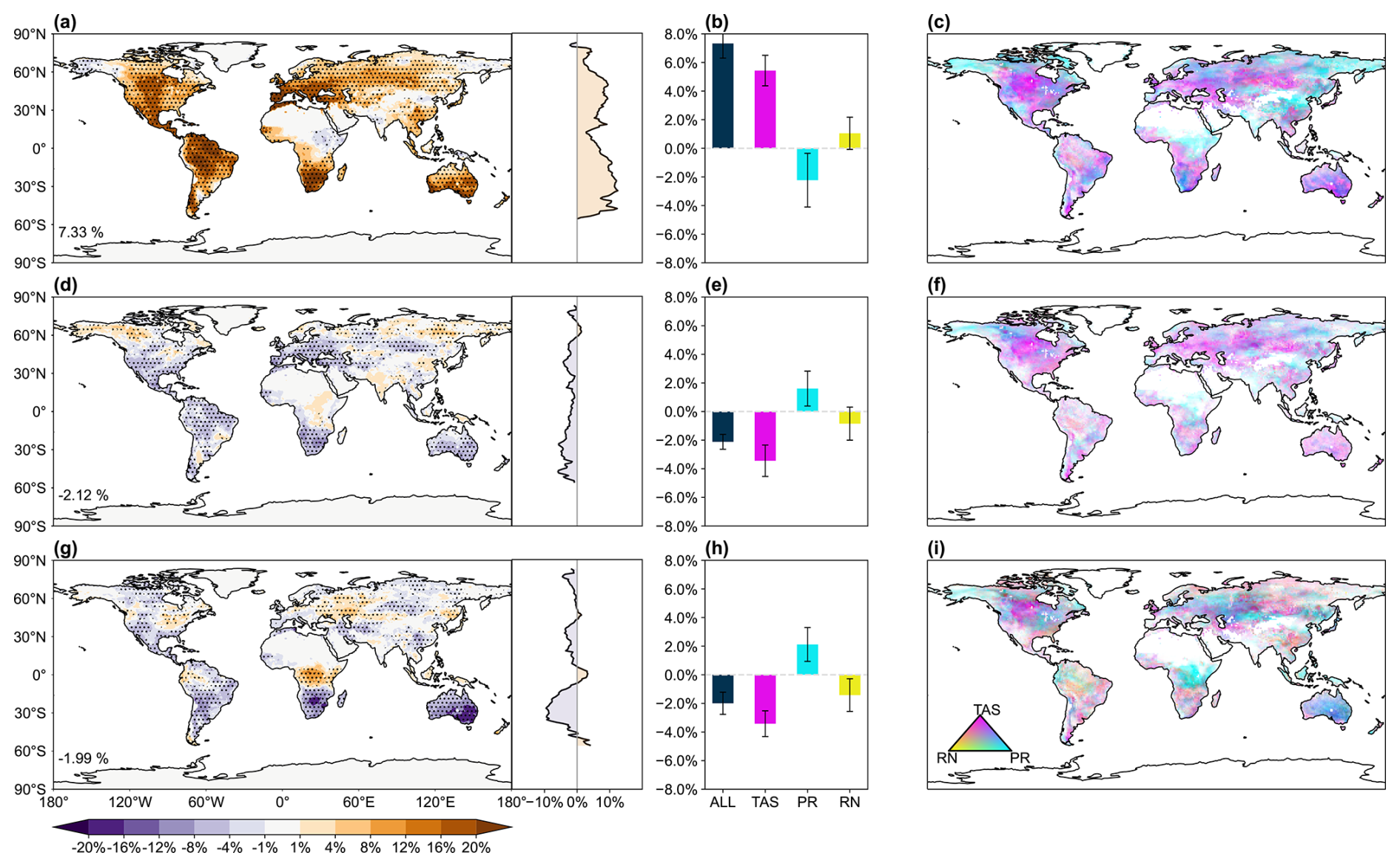 Figure 4Changes in frequency of drought extremes by global warming and SRM in GeoMIP. Results shown are the changes in frequency of drought extremes (scPDSI <4) at 2081–2100 under (a) SSP5-8.5 scenario relative to the historical period of 1995–2014, as well as that under b G6solar and (g) G6sulfur scenarios relative to SSP5-8.5 both at 2081–2100. The dotted areas indicate regions where at least four out of five models show changes with the same signs. Latitudinal distribution is shown on the right of each panel. Contributions of temperature (TAS), precipitation (PR), and radiation (RN) to changes in drought extremes are also presented, with bars in (b, e, h) representing the mean and errorbars indicating one standard deviation of predictions from five GeoMIP models. Colors in (c, f, i) indicate the dominant drivers of drought extremes.