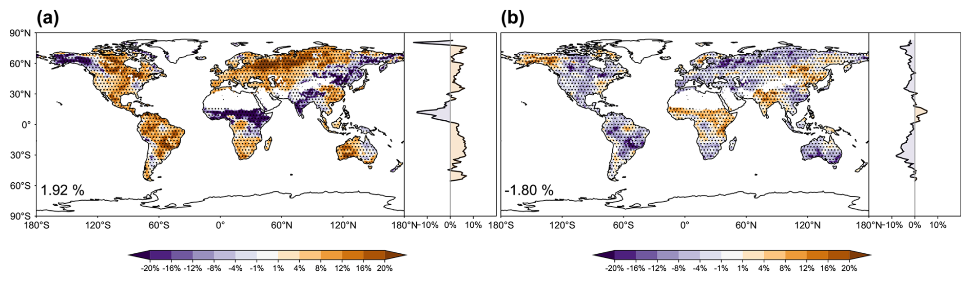 Figure 5Changes in frequency of drought extremes by global warming and SAI in GLENS. Results shown are the changes in frequency of drought extremes (scPDSI <4) at 2075–2094 under (a) RCP8.5 scenario relative to 2010–2030 baseline, as well as that under (b) SAI scenarios relative to RCP8.5 at 2075–2094. The dotted areas indicate regions where at least two out of three members show changes with the same signs. Latitudinal distribution is shown on the right of each panel. The global mean value of the difference is shown at the lower left of each panel.