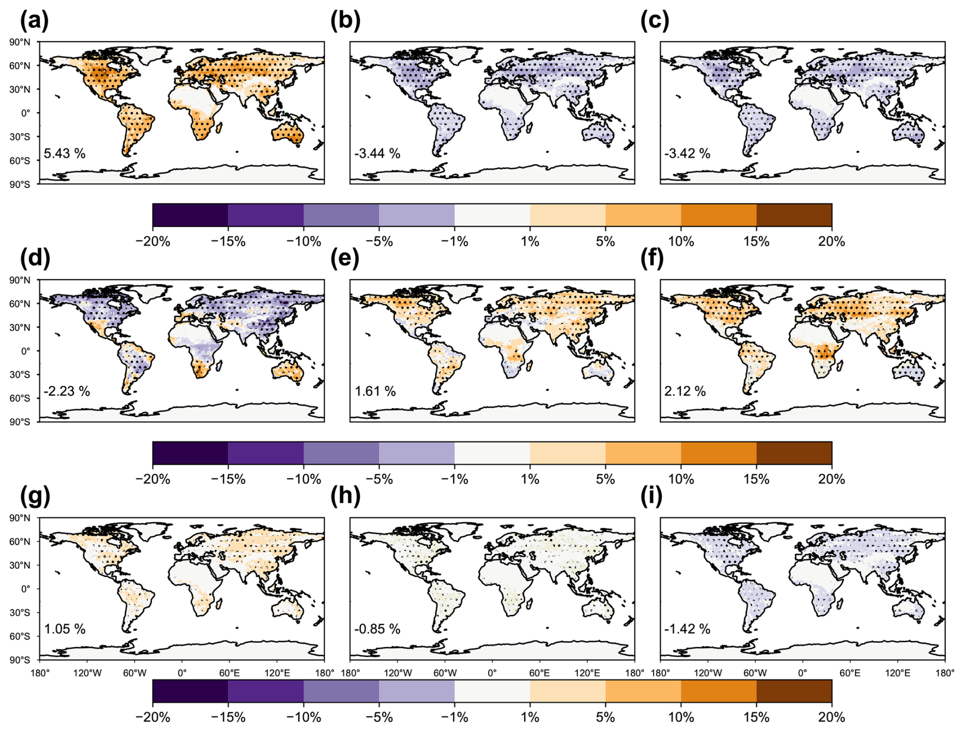 Figure 6Changes in frequency of drought extremes due to different climatic factors. Results shown are the changes in frequency of drought extremes (scPDSI <4) at 2081–2100 under SSP5-8.5 scenario relative to the historical period of 1995–2014 attributable to (a) temperature, (d) precipitation, and (g) radiation changes, as well as that under (b, e, h) G6solar and (c, f, i) G6sulfur scenarios relative to SSP5-8.5 both at 2081–2100 attributable to (b, c) temperature, (e, f) precipitation, and (h, i) radiation changes. The dotted areas indicate regions where at least four out of five models show changes with the same signs.
