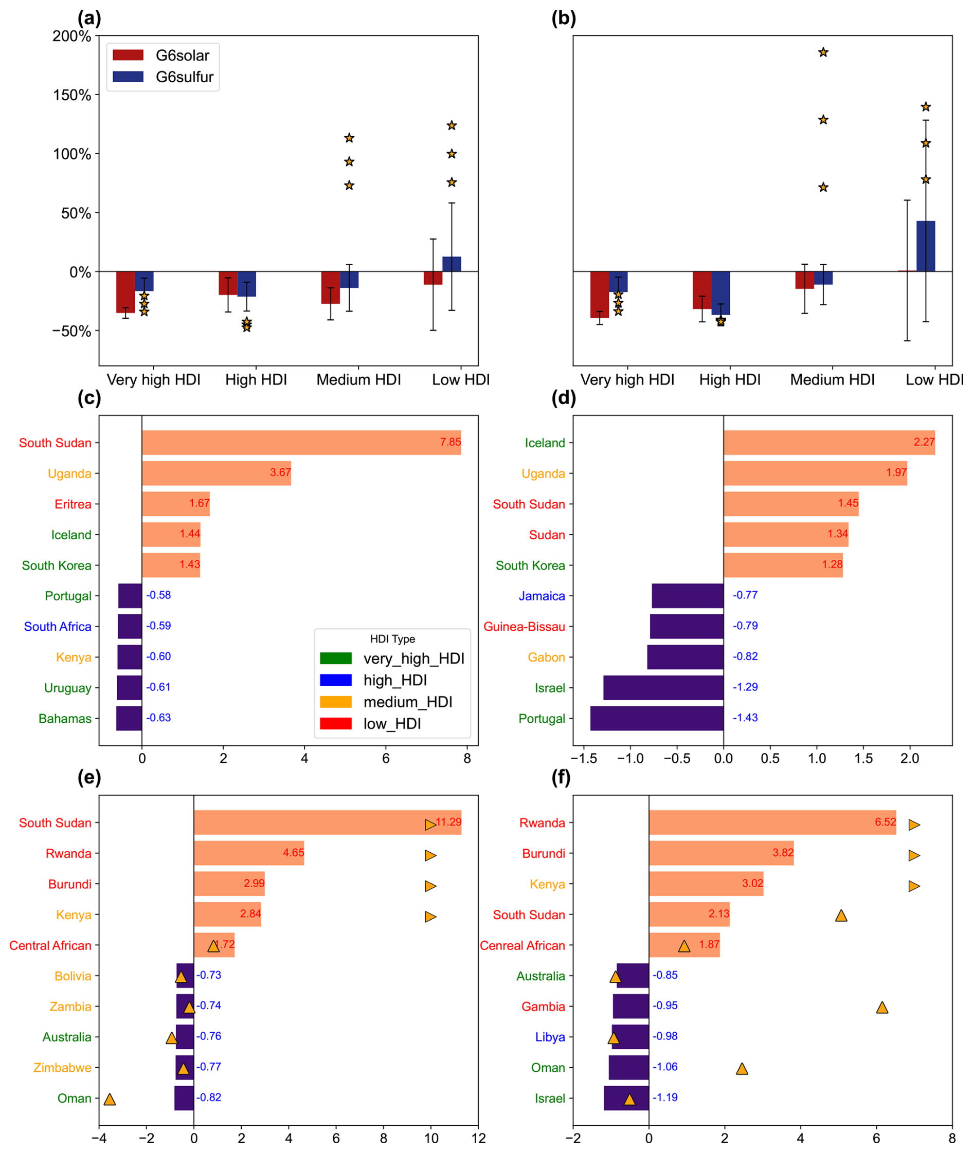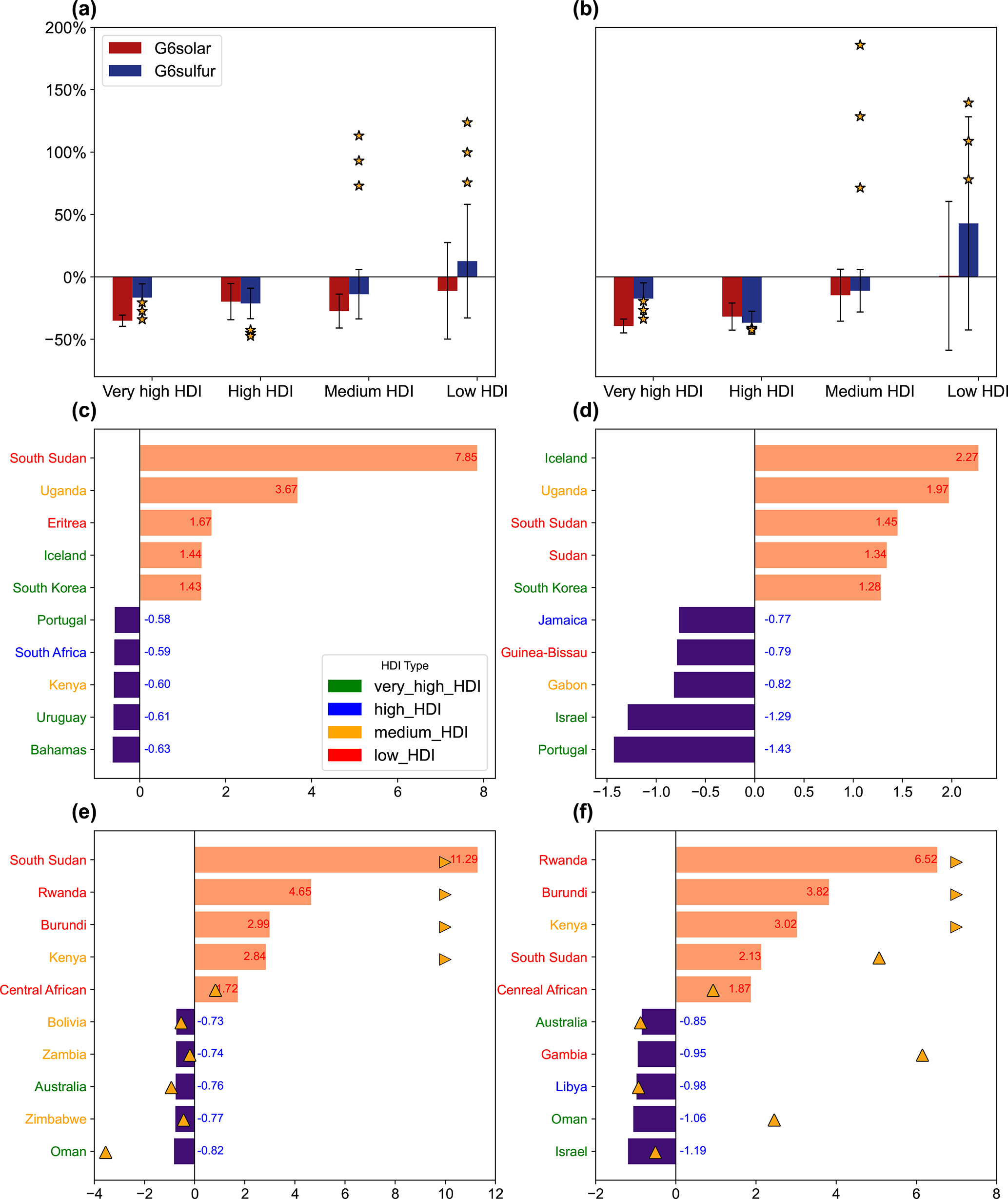 Figure 10Changes in GDP and population exposure to drought extremes by HDI. For each of four HDI groups, changes in (a) GDP or (b) population exposure to drought extremes for 2081–2100 in G6solar (blue) and G6sulfur (red) relative to SSP5-8.5 are normalized by the differences under SSP5-8.5 relative to 1995–2014. The bars represent the mean changes from five models with errorbars indicating one standard deviation for inter-model spread. Yellow stars represent results from three members of GLENS. The mitigation potential (MP, see Methods) is also calculated for individual countries, and the top 5 countries with the greatest mitigation (violet) or aggravation (orange) of (c, e) GDP and (d, f) population exposures to drought extremes are shown for (c, d) G6solar and (e, f) G6sulfur, respectively. The MP values (ratios of changes) are denoted for those top countries. Yellow triangles denote GLENS outcomes (right-aligned for values exceeding axis limits).