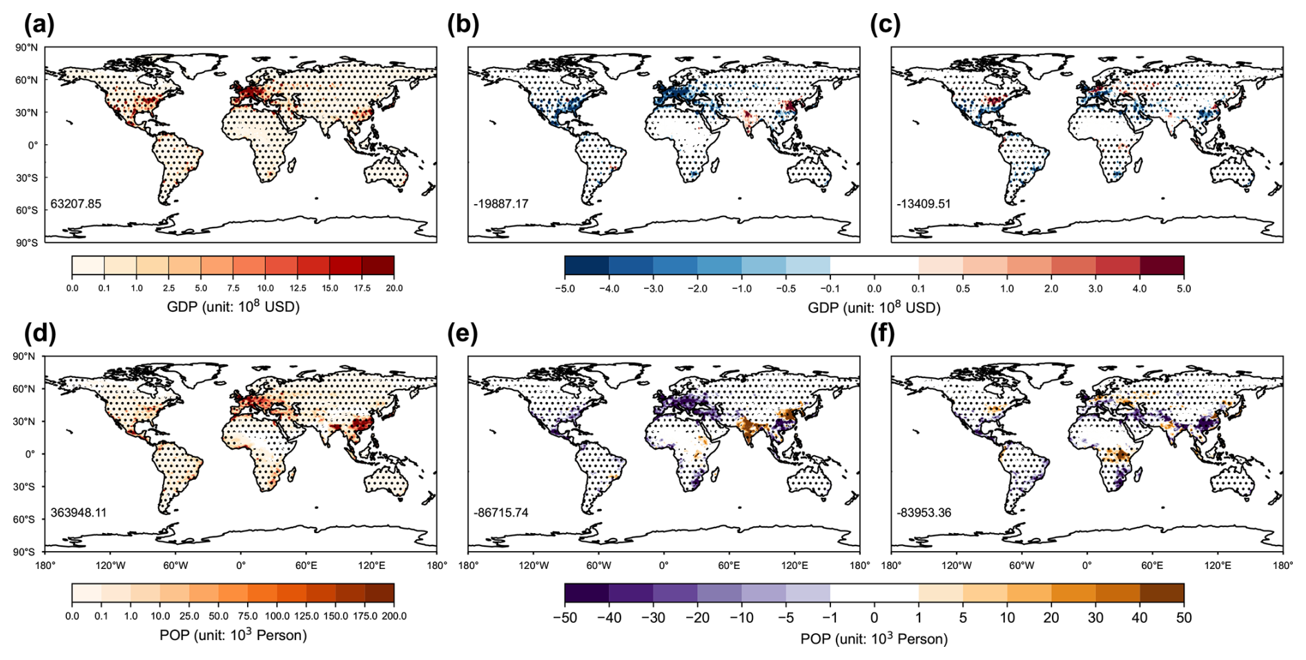 Figure 8Changes in GDP and population exposure to drought extremes. Results shown are the changes of (a, b, c) GDP and (c, d, f) population (POP) exposure to drought extremes at 2081–2100 (a, d) under SSP5-8.5 scenario relative to the historical period of 1995–2014, as well as that (b, e) under G6solar and (c, f) G6sulfur scenarios relative to SSP5-8.5 both at 2081–2100. The dotted areas indicate regions where at least four out of five models show changes with the same signs. The global sum value of the difference is shown at the lower-left of each panel.