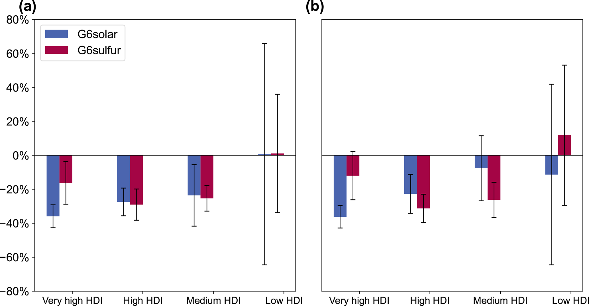 Here, Phist represents the drought probability or the exposure (either GDP or population) to drought extremes (scPDSI <4) at present day averaged for the period of 1995–2014. PSSP585 and PSRM represent the mean drought probability/exposure at 2081–2100 under the SSP5-8.5 and SRM (G6solar or G6sulfur) scenarios, respectively. We calculate the MP values for four different HDI groups of countries by summing the GDP or population exposure within each HDI group. For individual countries, we calculate the MP values based on the GDP or population exposure for that specific country. Our analyses showed that the denominator of Eq. (10) is positive for all four HDI groups and for 96 % of the 158 countries, indicating that extreme drought exposure is projected to increases in the future under the SSP5-8.5 scenario. A negative MP value indicates that SRM helps mitigate the warming-induced increase of extreme drought exposure, and vice versa. The units of the MP value can be expressed as a percentage (when MP < 1) or as a ratio (when MP > 1).