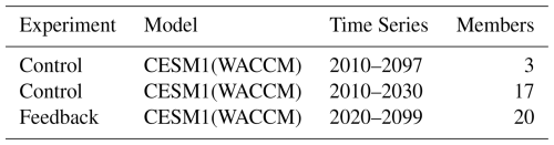 Tilmes, S., Richter, J. H., Kravitz, B., MacMartin, D. G., Mills, M. J., Simpson, I. R., Glanville, A. S., Fasullo, J. T., Phillips, A. S., Lamarque, J.-F., Tribbia, J., Edwards, J., Mickelson, S., and Ghosh, S.: CESM1(WACCM) Stratospheric Aerosol Geoengineering Large Ensemble Project, Bulletin of the American Meteorological Society, 99, 2361–2371, https://doi.org/10.1175/bams-d-17-0267.1, 2018.