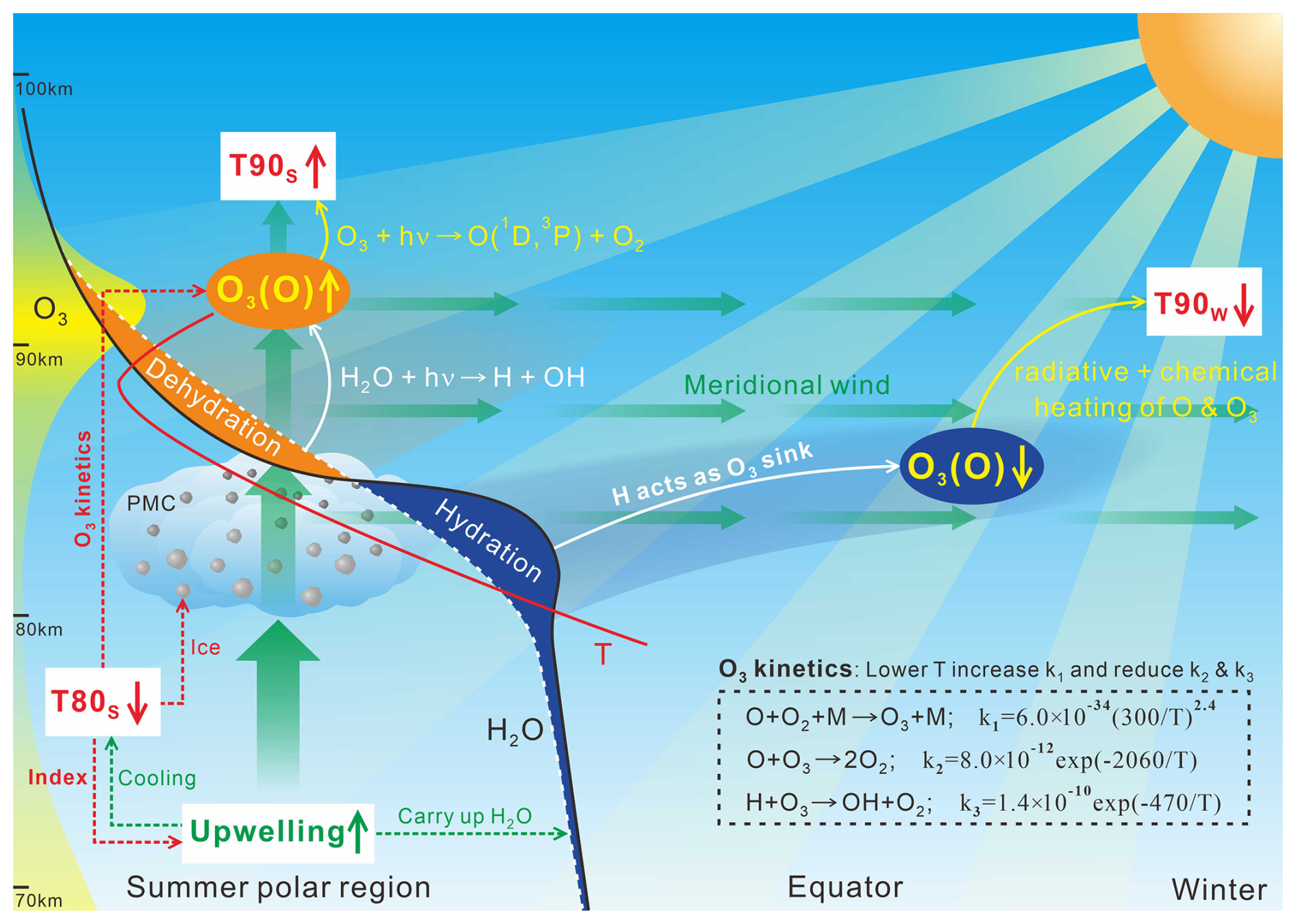 Our methodology examines the responses of mesospheric variables (H2O, H, O3, O, T90) to upwelling on interannual timescales. Since direct observations of summer polar upwelling are unavailable, we use temperature at ∼ 80 km (T80S) as a proxy, based on its relationship with adiabatic cooling. Figure 2 illustrates the conceptual framework for how summer polar upwelling drives interannual climate variability during solstice months through the interconnected pathways in the “upwelling–H2O(H)–O3(O)–T90” chain: