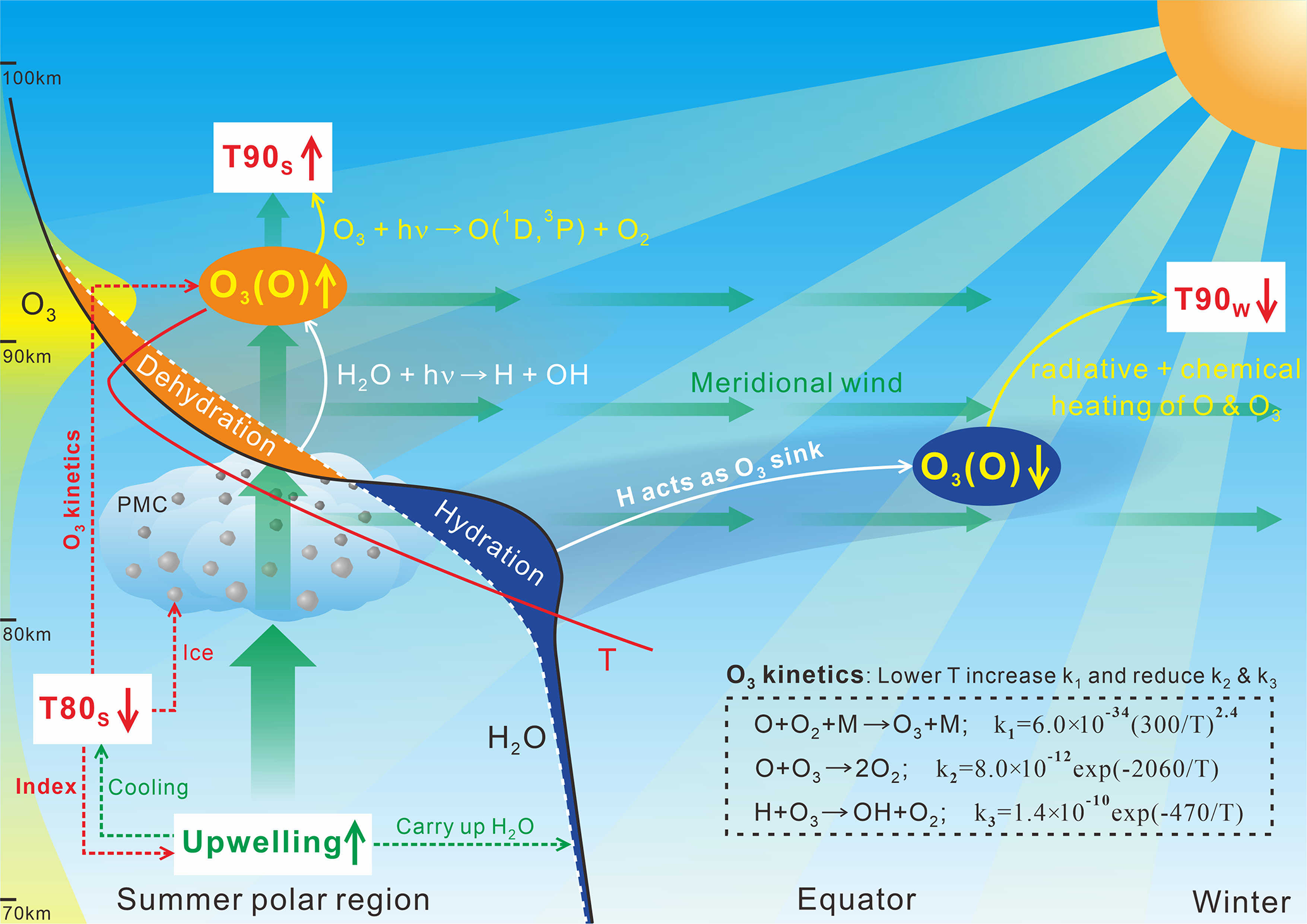 Figure 2Schematic diagram of the bottom-up control mechanism in solstice months, showing how summer polar upwelling controls interhemispheric climate variability through coupled dynamical and chemical processes. Key pathways include: (1) winter-hemisphere hydration is induced by summer polar upwelling in combination with meridional transport, and summer-hemisphere dehydration is governed by the cold-trap effect; (2) subsequent modulation of O3 through H-driven ozone loss and temperature-dependent ozone kinetics, with O varying in pace with O3 due to the ozone photochemical equilibrium assumption; and (3) resulting temperature (T90) variations via radiative and chemical heating of O3/O.