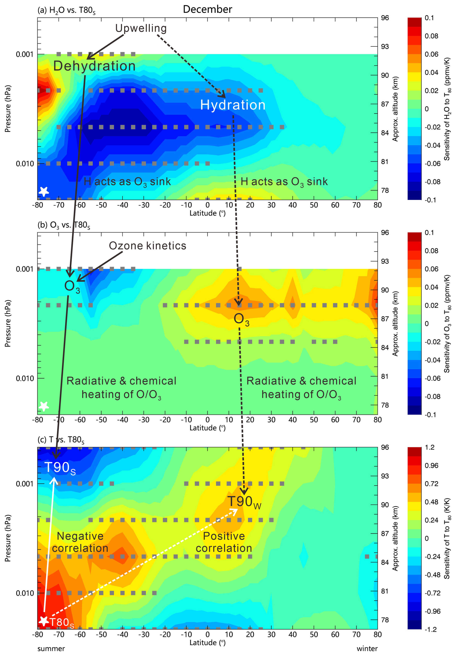 The summer hemisphere presents a more complex scenario involving competing processes. The O3 concentration in summer polar region is very low due to the destruction by sunlight and H2O (Fig. 1b), while the O concentrations do not differ much between the summer and winter hemispheres. The high sensitivity of T90S to O3 (51.7 K ppmv−1, Fig. 3c) in December is likely unrealistic. O-heating likely dominates the interannual variability of T90S, with O3-heating playing a minor role.