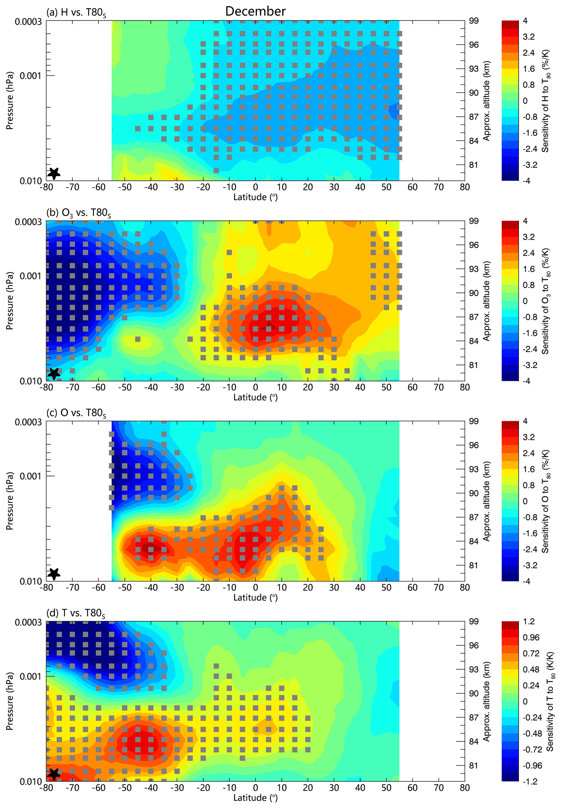 Figure 5Bottom-up control of atmospheric constituents in December from SABER observations during 2002–2019. (a) H response to upwelling (indicated by T80S, black stars at 75–83° S, 0.01 hPa level). (b) O3 and (c) O variations, both demonstrating hemispheric anti-symmetry in their sensitivity to T80S. (d) Resultant temperature responses showing a positive correlation between T90W and T80S and a negative correlation between T90S and T80S through the radiative and chemical heating of O and O3. All sensitivities (relative responses in unit of % K−1) have been derived from linear regression analysis of monthly data, with consistent upwelling-driven patterns across variables.