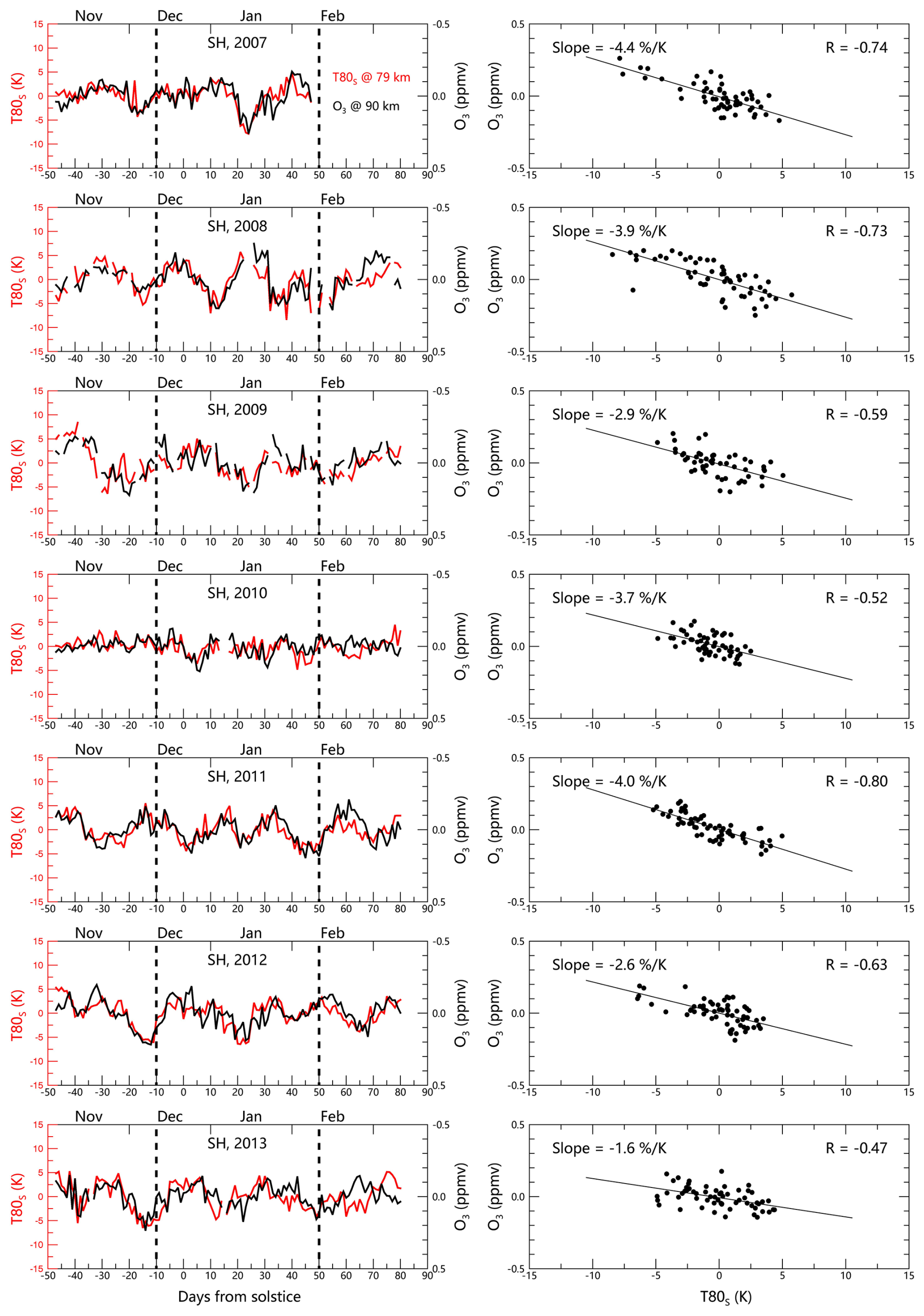 Figure 6Temporal relationship between T80S and O3 variations from SOFIE/AIM observations for the SH PMC seasons during 2007–2013. (Left) Daily time series of T80S at 79 km (red) and O3 at 90 km (black) at ∼ 70° S, with 35 d running mean removed. (Right) Correlation coefficients between T80S and O3 for each PMC season during −10 to 50 d relative to solstice, demonstrating consistent negative relationships (mean ) that highlight the bottom-up control of upwelling on ozone chemistry.