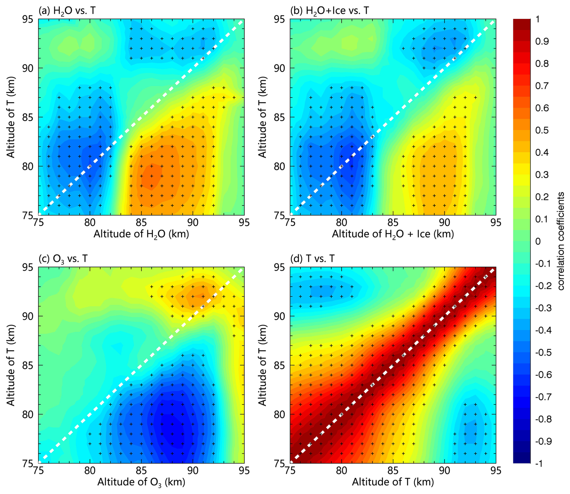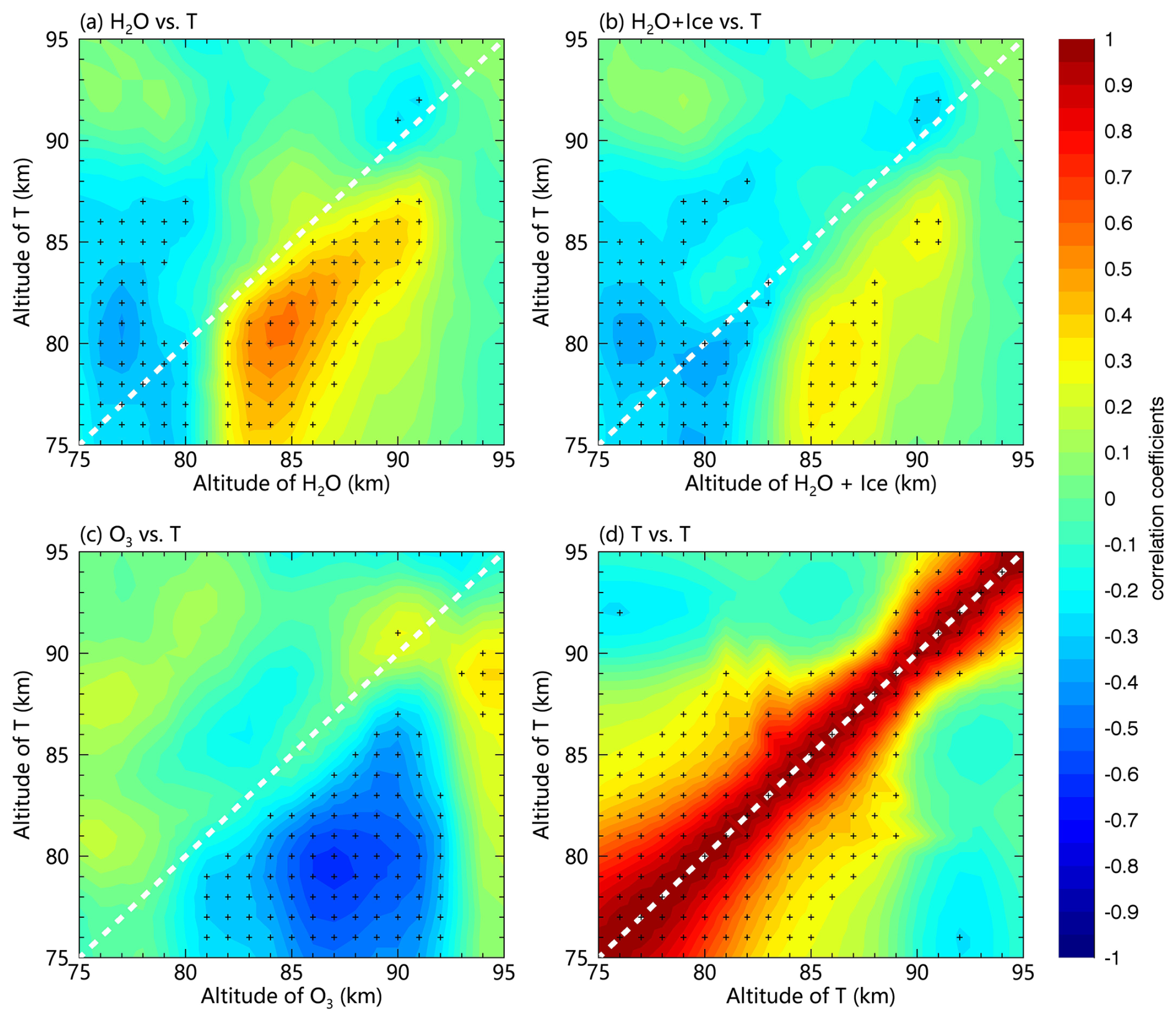 Figure 7Daily-scale bottom-up control processes observed by SOFIE at ∼ 70° S for the SH PMC seasons during 2007–2013. (a) H2O above and below 83 km are both subject to the control of T80S rather than local temperatures. (b) Combined H2O and ice content demonstrate similar T80S dependence. (c) Anti-correlation between O3 and T80S, accompanied by positive O3-T90 relationship. (d) Negative correlation between T90S and T80S. Correlation coefficients are calculated for −10 to 50 d relative to solstice (35 d running mean removed), with the 0.95 significance level marked by dots.