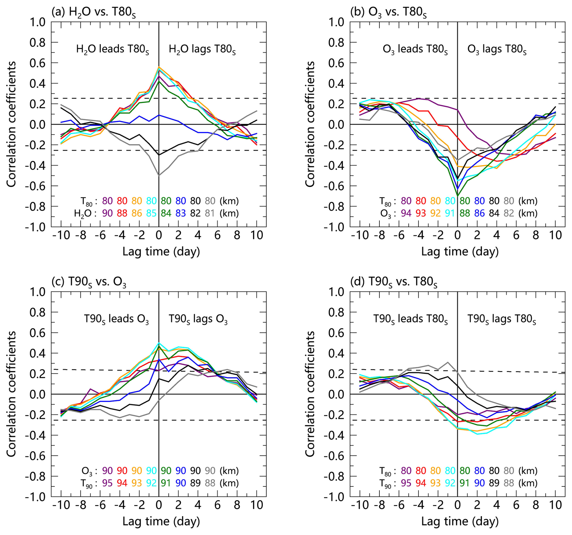 Figure 8Time-lag analysis of bottom-up control processes from SOFIE observations at ∼ 70° S for the SH PMC seasons during 2007–2013. (a) Immediate response (zero-day lag) of both hydration (negative H2O-T80S correlation) and dehydration (positive H2O-T80S correlation) to upwelling. (b) O3 response showing altitude-dependent lags to T80S. (c) T90S lags behind O3 by ∼ 3 d, possibly due to the radiative and chemical heating. (d) T90S lags after T80S by ∼ 3 d, indicating the cumulative response time of the full upwelling-H2O-O3-T90S chain. Correlation coefficients are calculated similar to Figs. 6–7, with dashed lines marking the 0.95 significance level.