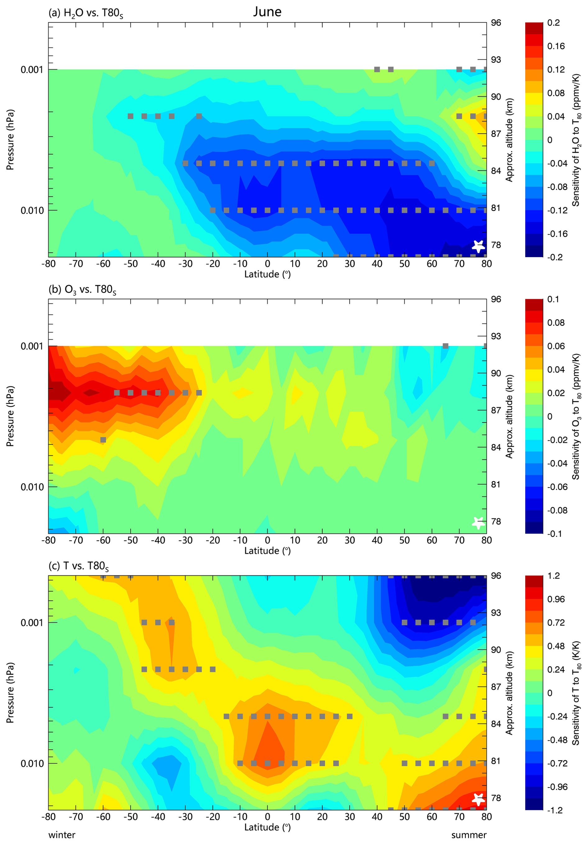 Figure 10Spatial patterns of bottom-up control processes during June showing (a) H2O, (b) O3, and (c) temperature responses to upwelling (indicated by T80S, white stars), analogous to but weaker than December patterns (Fig. 4). Sensitivities derived from linear regression of MLS/Aura data (2004–2022) show reduced but still significant anti-phase relationships between hemispheres compared to December. Gray dots mark the 0.95 significance level. Note the responses of variables in winter hemisphere extend to ∼ 50° S in June.