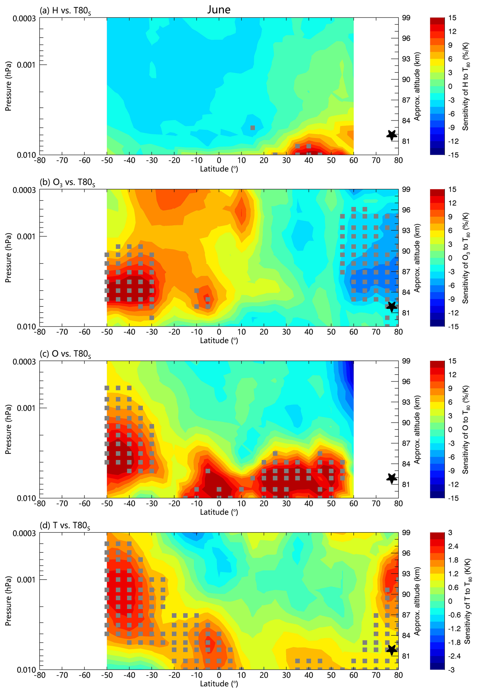 Figure 11Bottom-up control of atmospheric constituents in June from SABER observations (2002–2019), showing analogous but weaker responses than December (Fig. 5). (a) H shows insignificant response to upwelling (indicated by T80S, black stars at 75–83° N, 0.006 hPa). (b) O3 and (c) O variations exhibit reduced hemispheric anti-symmetry in sensitivity to T80S. (d) The positive T90W responses in wither hemisphere maintain, but the negative T90S responses disappear. All sensitivities have been derived from linear regression analysis of monthly data.