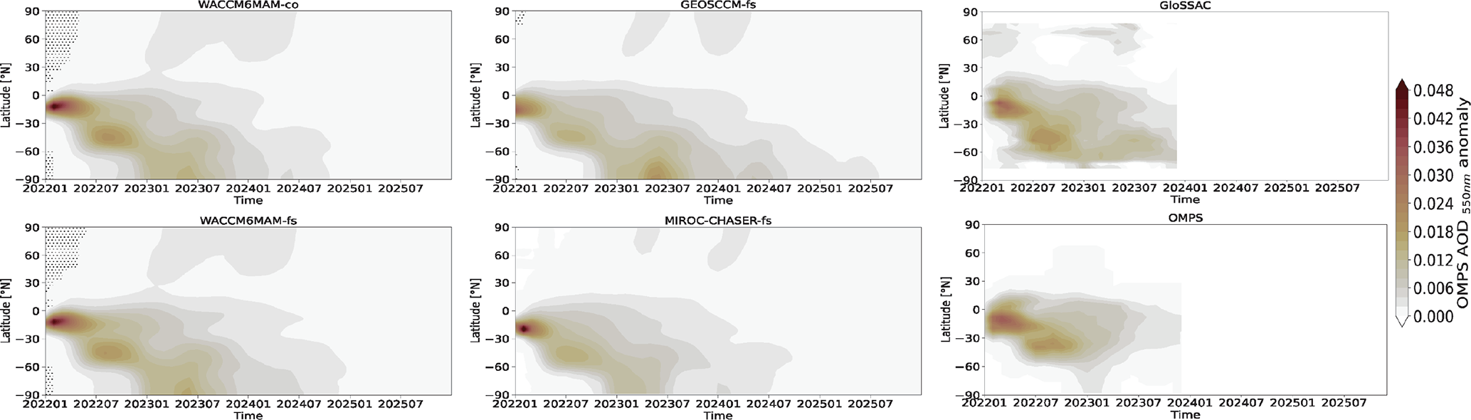 Model simulations demonstrate reasonable agreement with observed latitudinal SAOD distribution patterns (Fig. 1). Both GloSSAC and OMPS show a decrease in SAOD over time as aerosols are transported toward the SH high latitudes. WACCM6MAM–co, WACCM6MAM–fs, and MIROC–CHASER–fs all exhibit similar trends, although with a stronger SAOD in the tropics compared to the observations. In contrast, GEOSCCM–fs displays weaker SAOD in the tropics and a stronger SAOD in the polar regions (60–90° S) by mid-2023, compared to mid-latitudes (30–60° S) in mid-2022. Additionally, GEOSCCM–fs shows a larger SAOD anomaly in the SH polar latitudes during the boreal summers of 2024 and 2025, indicating that the SAOD anomaly may persist for a longer duration compared to other models, where the anomaly diminishes mostly by the end of 2024. These differences may stem from uncertainties on both the modeling and satellite observation sides, including variations in simulated aerosol microphysics and dynamics, as well as uncertainties in aerosol estimates from GloSSAC and OMPS retrievals. Understanding these differences and uncertainties is a key objective of the Tonga Model Intercomparison Project (Tonga–MIP; Clyne, 2024), which, as a parallel initiative, will also contribute to the Hunga Assessment Report (Zhu et al., 2025).