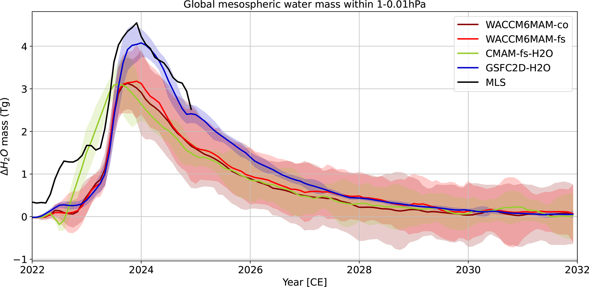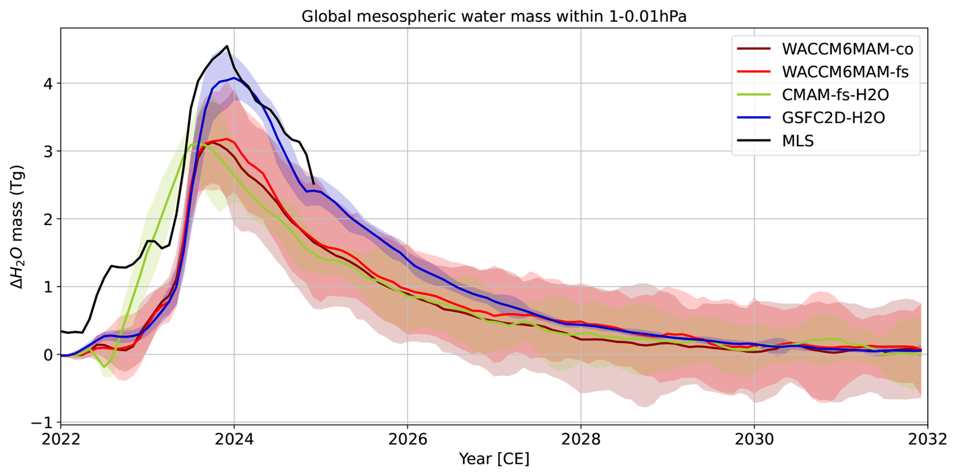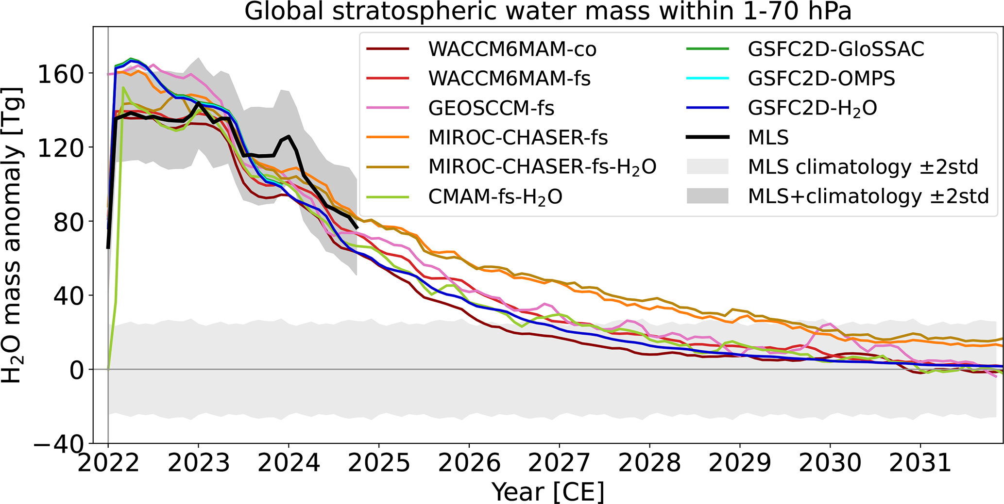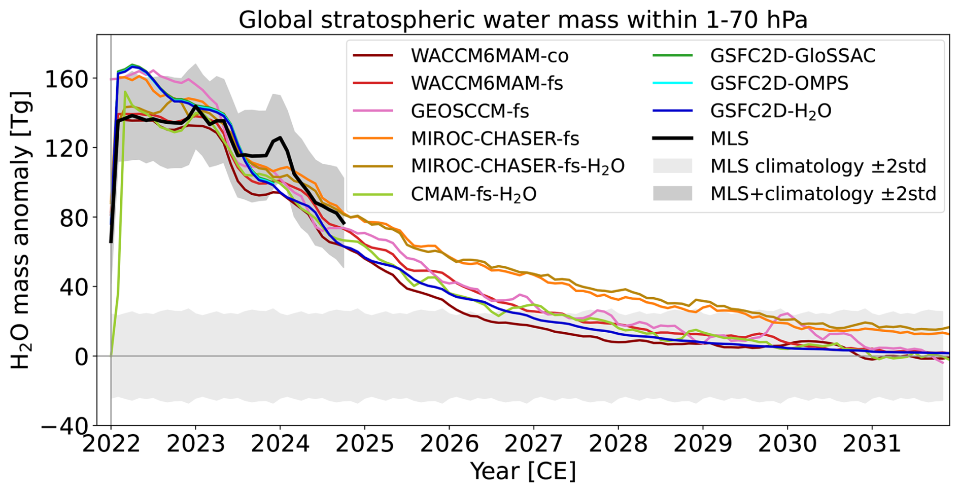 Millán et al. (2024) estimated that the anomalous state induced by the Hunga eruption could diminish within 5–7 years based on an exponential decay using MLS observations – a timescale that closely aligns with projections from the model simulations in this study. Among the simulations, the only one with a coupled ocean (WACCM6MAM–co) exhibits the shortest perturbation duration, with stratospheric H2O mass returning to climatological levels within four years (by 2026). This may reflect a faster transport and more efficient H2O removal process in the coupled ocean simulation compared to the fixed-SST configuration. Additional model simulations with coupled oceans are needed to confirm this. The longest perturbation, lasting up to seven years (until 2029), is projected by MIROC–CHASER–fs, while the other models suggest a duration of approximately 5 years, until 2027. The current decreasing trend in MLS H2O mass lies within the range of model projections, suggesting a potential perturbation lasting around five years. This prolonged anomaly has significant implications for the climate system.