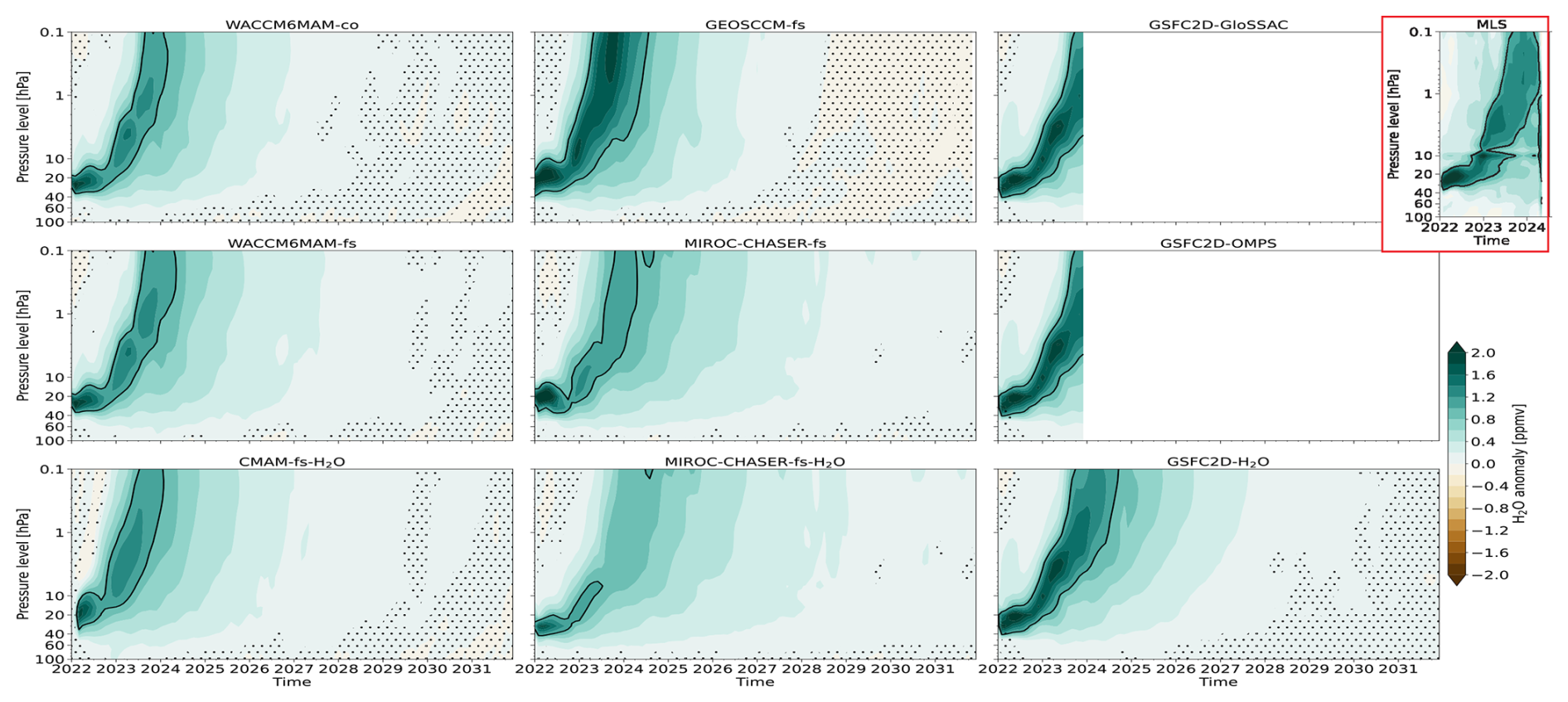 Figure 3Simulated and observed (red inset box) global mean H2O anomalies following the Hunga eruption. The modelled anomalies are relative to the control run. Dotted grids indicate statistically insignificant anomalies at the 95 % confidence level based on Student's t-tests. The solid black contours indicate an anomalous H2O concentration of 1 ppmv.