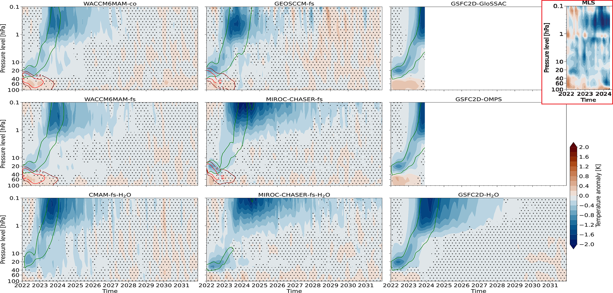 The upper-level cooling and lower-level warming dipole response pattern is reasonably reproduced by the model simulations, although with a smaller magnitude in most models compared to MLS. The significant cooling in the middle stratosphere (10–40 hPa) is more persistent than in the upper stratosphere (1–10 hPa), lasting between 3.5 and 4.5 years – until mid-2025 in WACCM6MAM–co and mid-2026 in GEOSCCM–fs. The strongest cooling is observed in the mesosphere above 1 hPa, where it persists for at least five years, until 2027, in GEOSCCM–fs and CMAM–fs–H2O. This cooling persists even longer in simulations by WACCM6MAM, MIROC–CHASER, and GSFC2D, with the longest duration of up to 10 years observed in MIROC–CHASER–fs–H2O. The modeled significant warming in the lower stratosphere is most prominent in 2022 in GEOSCCM–fs and MIROC–CHASER–fs. However, a more prolonged warming, extending into early and mid-2023, is observed in WACCM6MAM–co and WACCM6MAM–fs. This warming is also evident – and even stronger – in GSFC2D–GloSSAC and GSFC2D–OMPS.