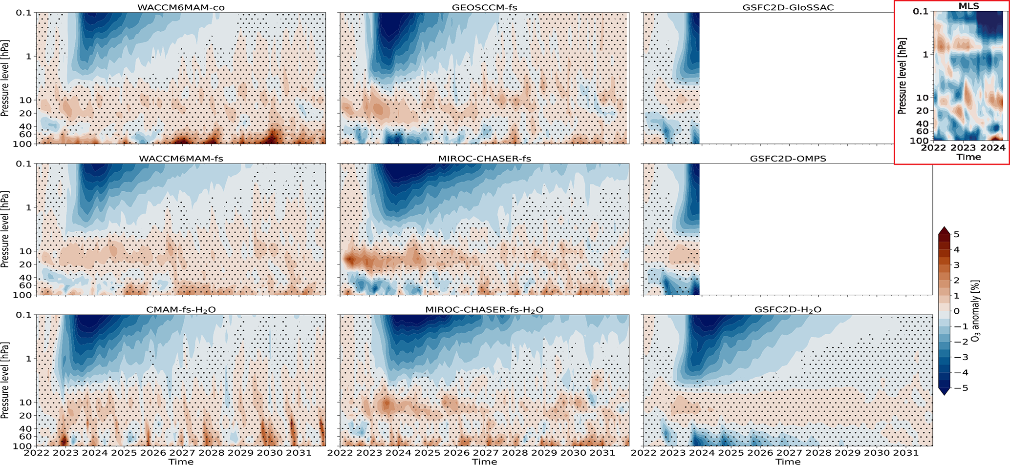 MLS data indicate ozone depletion in the lower stratosphere (20–100 hPa), an ozone increase in the middle stratosphere (around 10 hPa), and ozone depletion in the upper stratosphere (1–5 hPa), with the most pronounced depletion occurring in the lower mesosphere (0.1–1 hPa) in mid 2023–2024 (Fig. 5). This triple-response pattern – characterized by middle stratospheric ozone enhancement flanked by depletion above and below – is well captured by all model simulations, except for CMAM–fs–H2O, which exhibits very limited ozone depletion in the lower stratosphere. However, the magnitude and timing of these ozone changes vary among models.