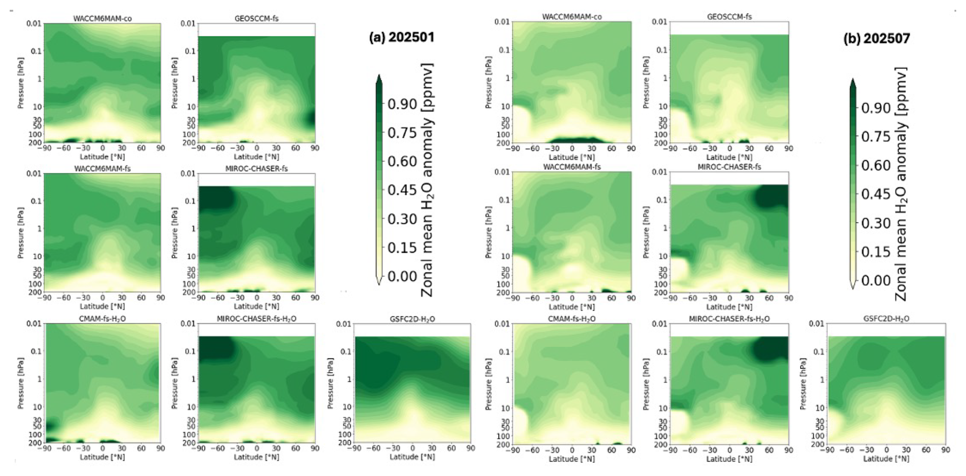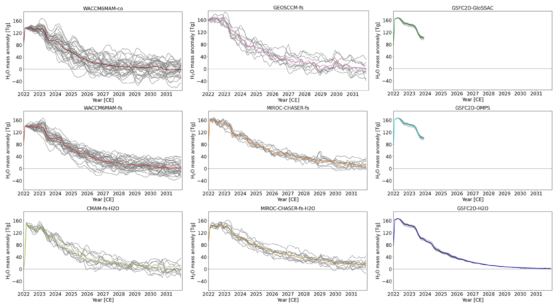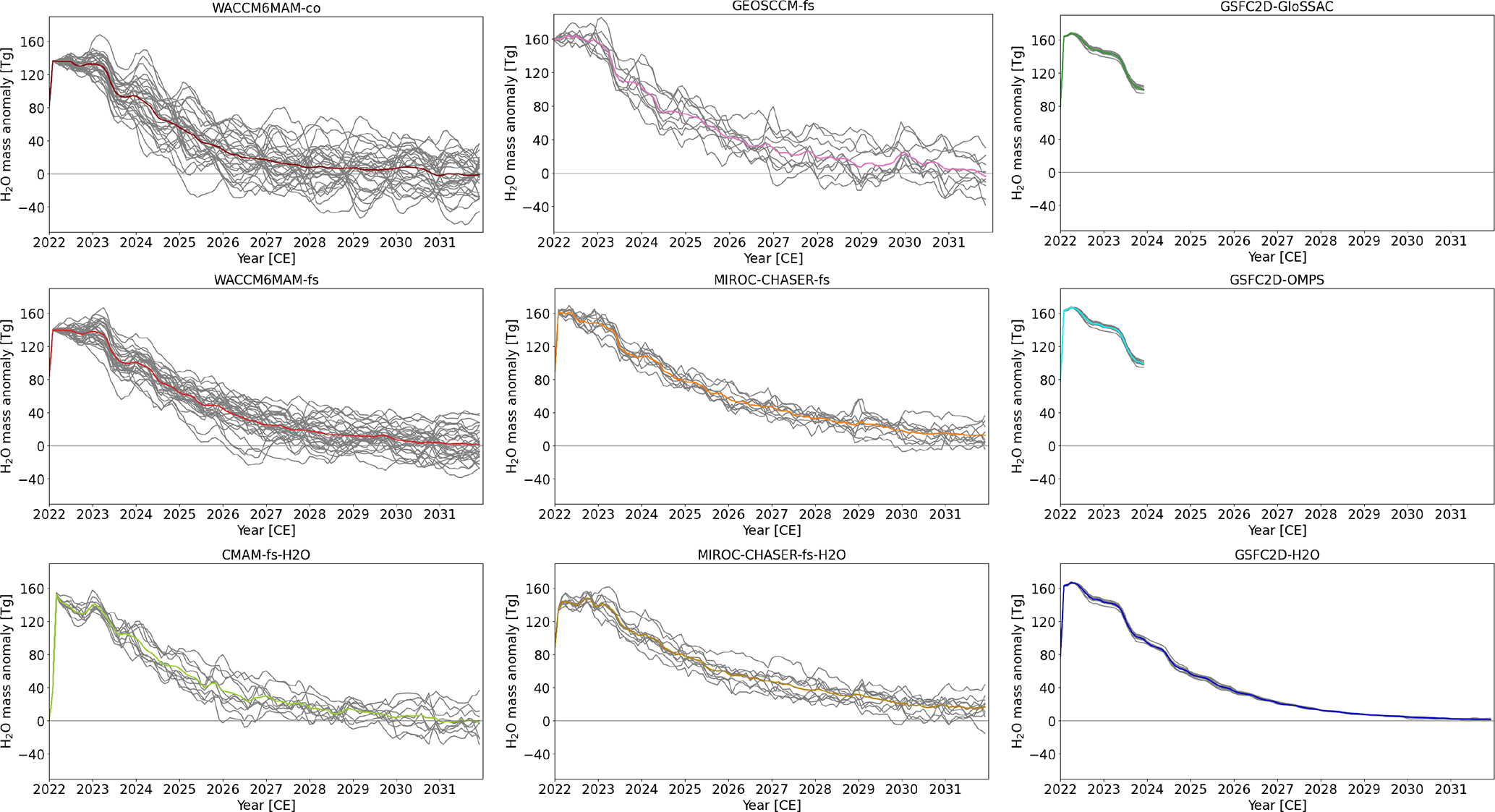 The maximum H2O mass across models generally falls within the range of 130–160 Tg. Prior to initiating the ensemble simulations, model adjustments were made to achieve the protocol target of retaining 150 Tg of H2O by the end of January 2022. However, due to internal variability within free-running models, individual ensemble members exhibit different evolutionary trajectories, leading to variations in maximum H2O burden among members (Fig. A1). Additionally, differences in microphysical and dynamical processes across models further contribute to variations in both the peak H2O mass and the timing of peak occurrence. WACCM6MAM–co reaches its peak of 136 Tg the fastest, within two months, whereas MIROC–CHASER–fs–H2O takes the longest, requiring ten months to reach 148 Tg. The earliest e-folding time from peak mass occurs in November 2024 in GSFC2D–H2O, while MIROC–CHASER–fs-H2O exhibits the latest, in May 2026, with corresponding e-folding times of 31 and 43 months, respectively.