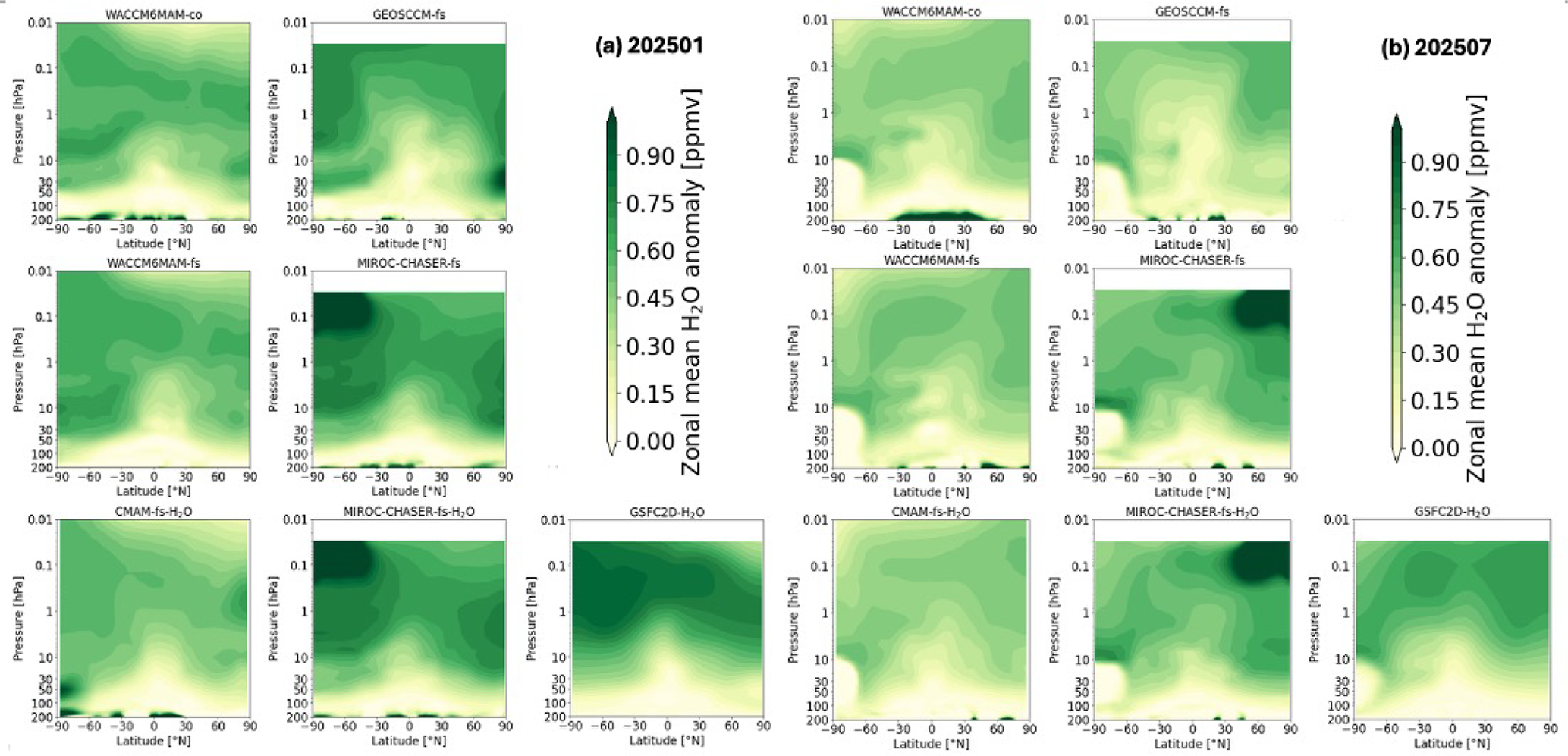 To isolate the effects of volcanic aerosols from those of H2O, additional H2O–only injection simulations were conducted. Three models (MIROC–CHASER–fs–H2O, GSFC2D–H2O, and CMAM–fs–H2O), performed these simulations.