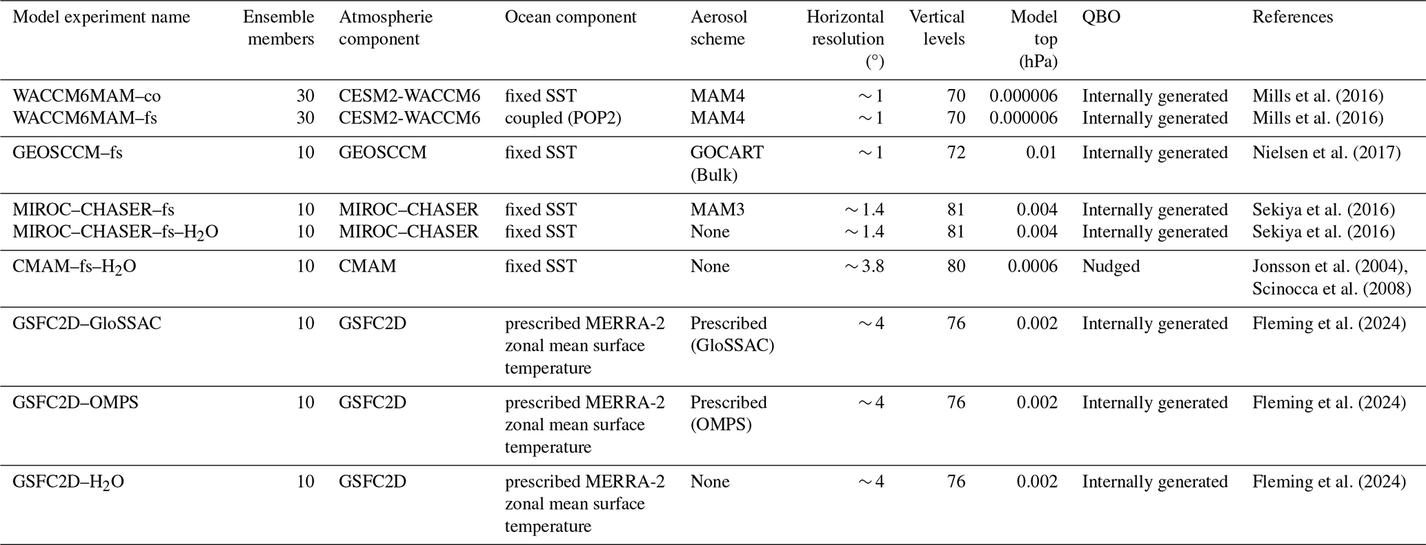 Mills et al. (2016)Mills et al. (2016)Nielsen et al. (2017)Sekiya et al. (2016)Sekiya et al. (2016)Jonsson et al. (2004)Scinocca et al. (2008)Fleming et al. (2024)Fleming et al. (2024)Fleming et al. (2024)WACCM6MAM conducted simulations with both coupled ocean and fixed sea surface temperature (SST) configurations, labelled WACCM6MAM–co and WACCM6MAM–fs, respectively, while MIROC–CHASER–fs and GEOSCCM–fs used fixed SST only. The GSFC2D model prescribed aerosol injection using satellite–derived aerosol extinction data, with simulations labelled GSFC2D–GloSSAC and GSFC2D–OMPS based on the data used.