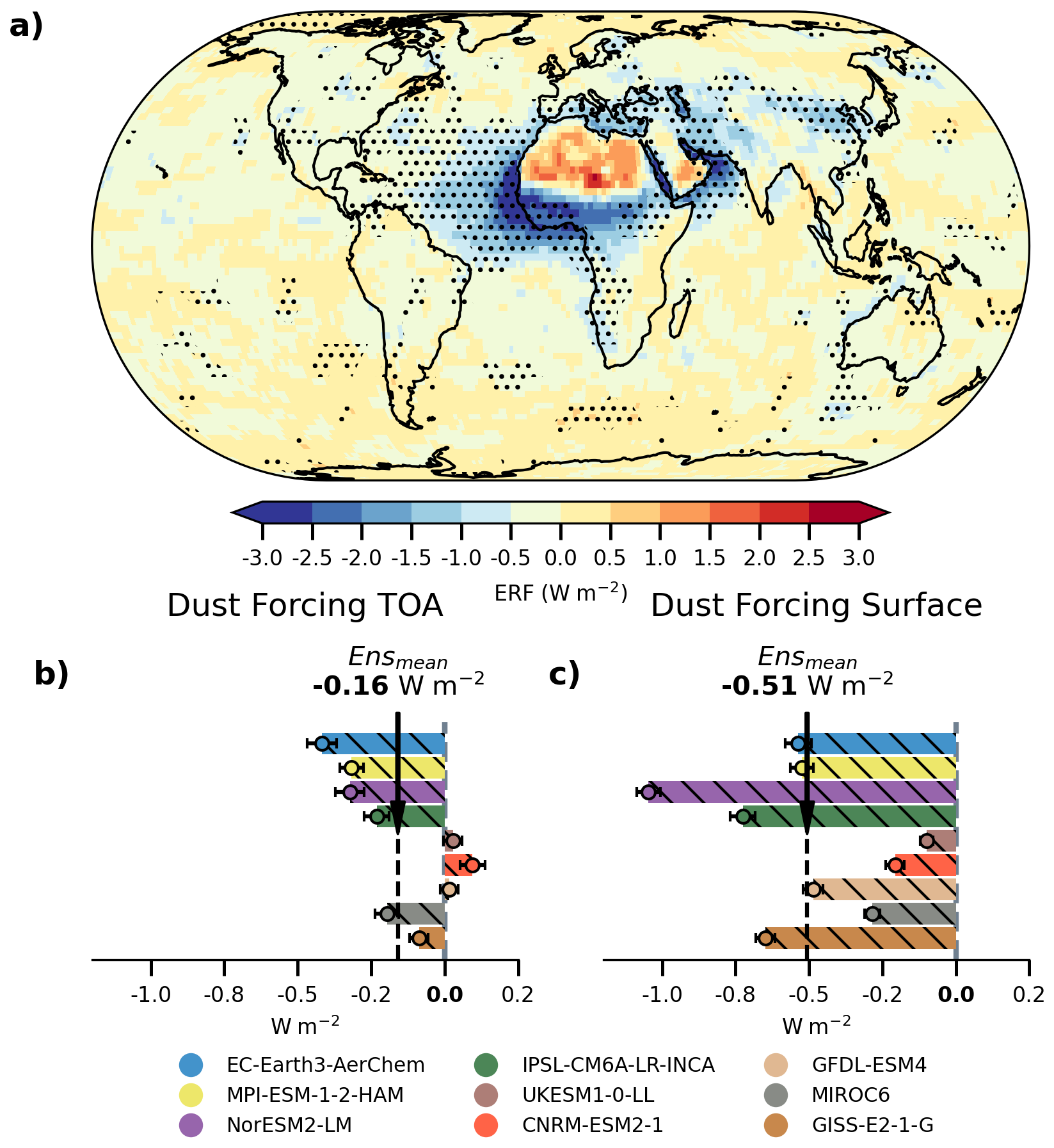 Figure 1(a) Multi model mean DuERF from piClim-2xdust vs piClim-control. The stippling indicates where on the map at least 7 of the 9 models agree on the sign of the forcing. (b) Global mean DuERF for each model. (c) Global mean forcing at the surface. The error bar shows the standard error of the mean for each model.