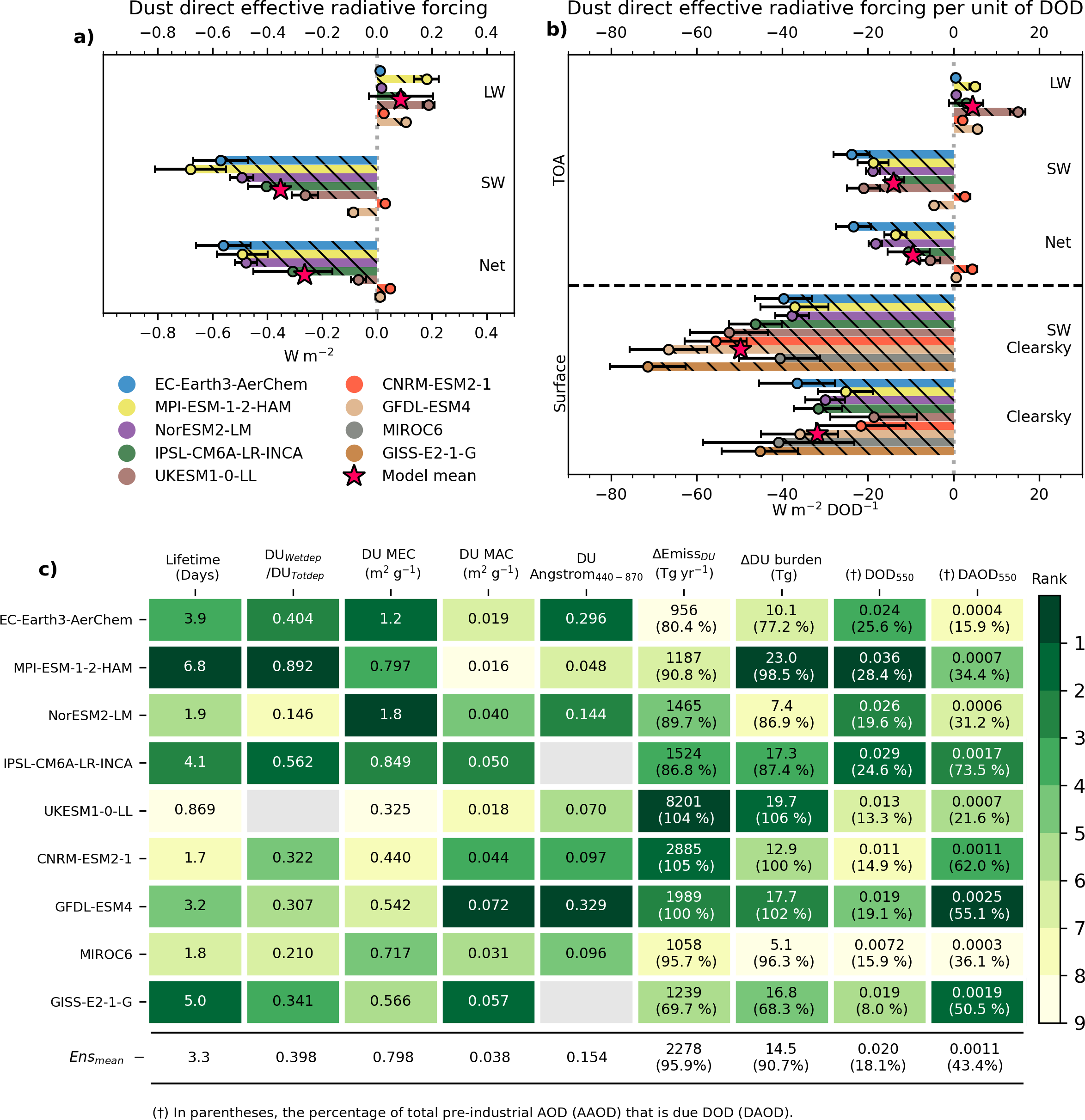 Figure 2Global mean dust direct effective radiative forcing (a) and direct effective forcing efficiency (b) from piClim-2xdust vs piClim-control. The forcing efficiency is shown for both the surface and TOA, while the radiative forcing is only for TOA. For each model the error-bar indicates the model's standard error of the mean forcing. The red star indicates the multi-model mean. Global mean diagnostics of dust cycle and optical parameters (c) are presented. Intensive parameters (DU, Lifetime, Angstrom440−870, DU MAC and DU MEC), are exclusively related to dust representation in the model. Dust Angstrom coefficient is calculated based on the change in AOD440 and AOD870. The dust mass extinction (absorption) coefficient DU MEC (DU MAC) is defined as DOD550 (ΔDOD550) divided by ΔDU burden. Lifetime is approximated as ΔDU burden divided by ΔDU Totdep. Extensive parameters dependent on dust load (ΔEmissDU, ΔDU burden, DOD550, DOD550) are depicted as the differences between piClim-2xdust and piClim-control, with the corresponding relative changes from piClim-2xdust indicated in parentheses. The shading shows the ranking of the models for a given diagnostic, from the model with the largest value (dark-shading) to the model with the smallest value (light shading).