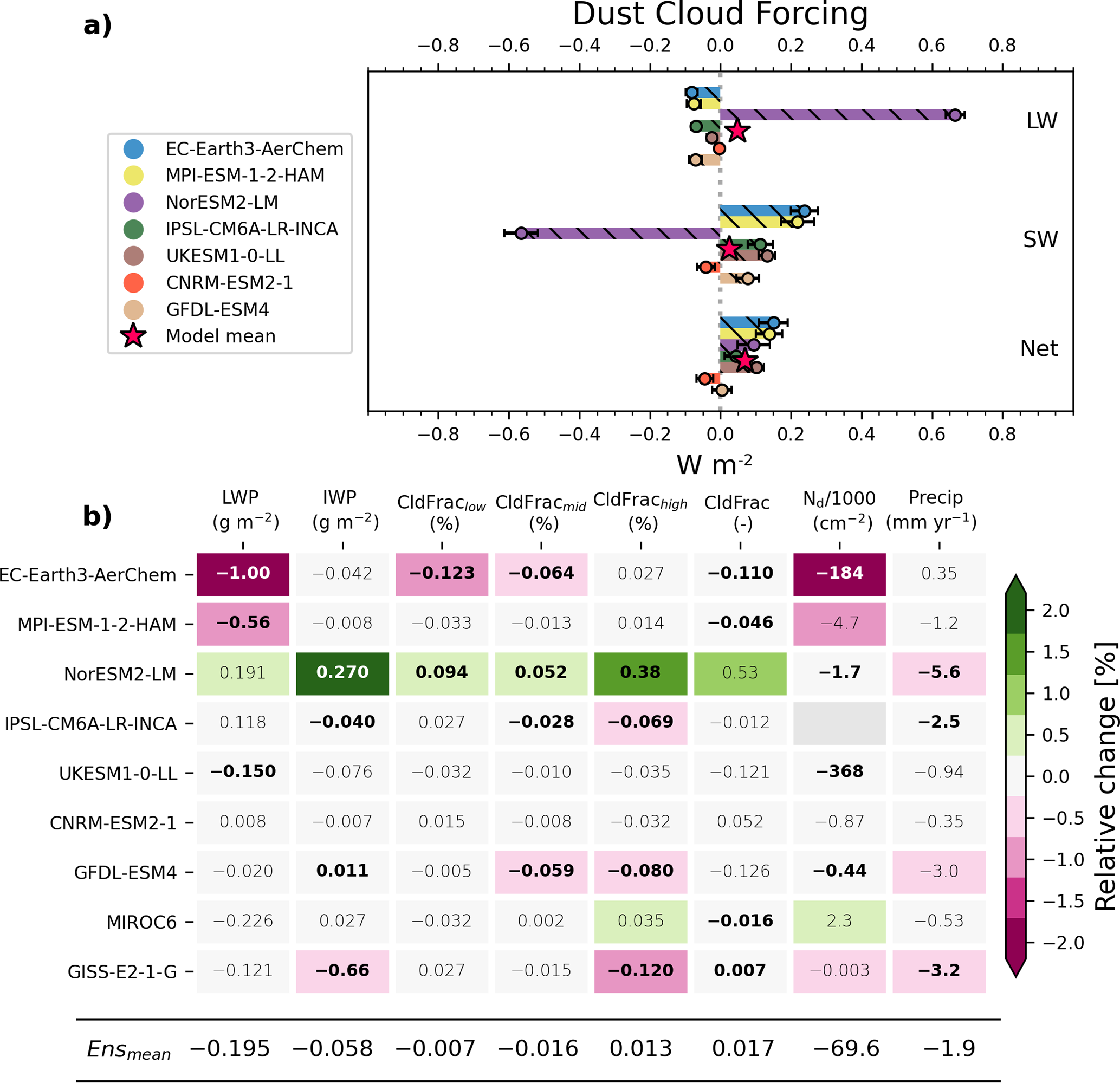 Figure 3(a) Global mean cloud dust effective radiative forcing (cloud DuERF). The error bars correspond to one standard deviation of the modelled cloud DuERF and the red stars indicate the multi-model mean. (b) Global mean change due to dust (piClim-2xdust − piClim-control) of the following cloud properties: liquid water path (LWP), ice water path (IWP), low, medium and high and total cloud fraction (CldFrac), cloud droplet number concentration (Nd), precipitation (Precip). Bold values indicate that the difference between piClim-2xdust and piClim-control is significantly different from zero at a 95 % confidence level. The colour shading shows the relative change between the two simulations.