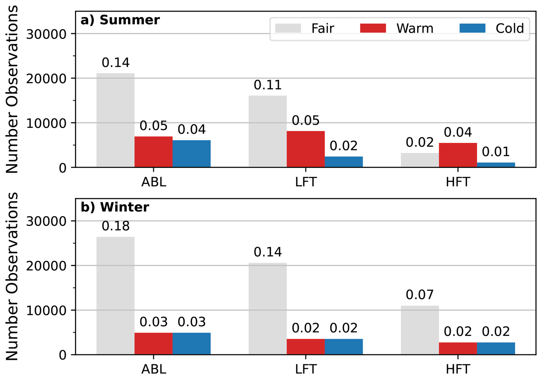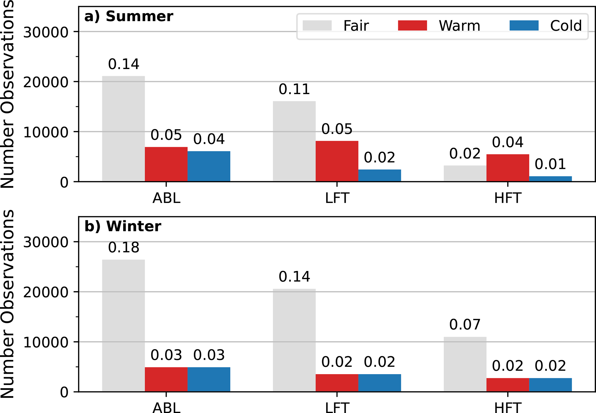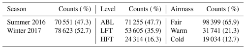 All data are averaged to 5 s temporal resolution, which corresponds to an approximate spatial resolution of 500–600 m based on the airspeed of the aircraft. Data without airmass information, with unusually high [CO2], indicative of CO2 point sources, ([CO2] > 430 ppm), and unrealistic wind velocities (u or v> 100 ms−1) are discarded before the analysis. The [CO2] level of 430 ppm was chosen to be substantially higher than values typically found in the dataset such that few data points were eliminated. However, there were several instances when the planes flew in vicinity to industrial or fossil fuel power plants with [CO2] greatly exceeding 430 ppm. The remaining 149 174 observations used in this study have an approximately even distribution between summer and winter, but the sampling varies considerably with respect to level and airmass. Specifically ABL and fair weather air make up 48 % and 66 % of observations, respectively (Table 1). Separating the data by season, level, and airmass (Fig. 1) reveals a stark imbalance in the number of fair weather and near-frontal warm and cold airmass observations for all levels and seasons except for HFT during summer, when few fair weather observations exist. There are also mores warm sector observations than cold sector observations at all levels during summer, while this is not the case during winter.