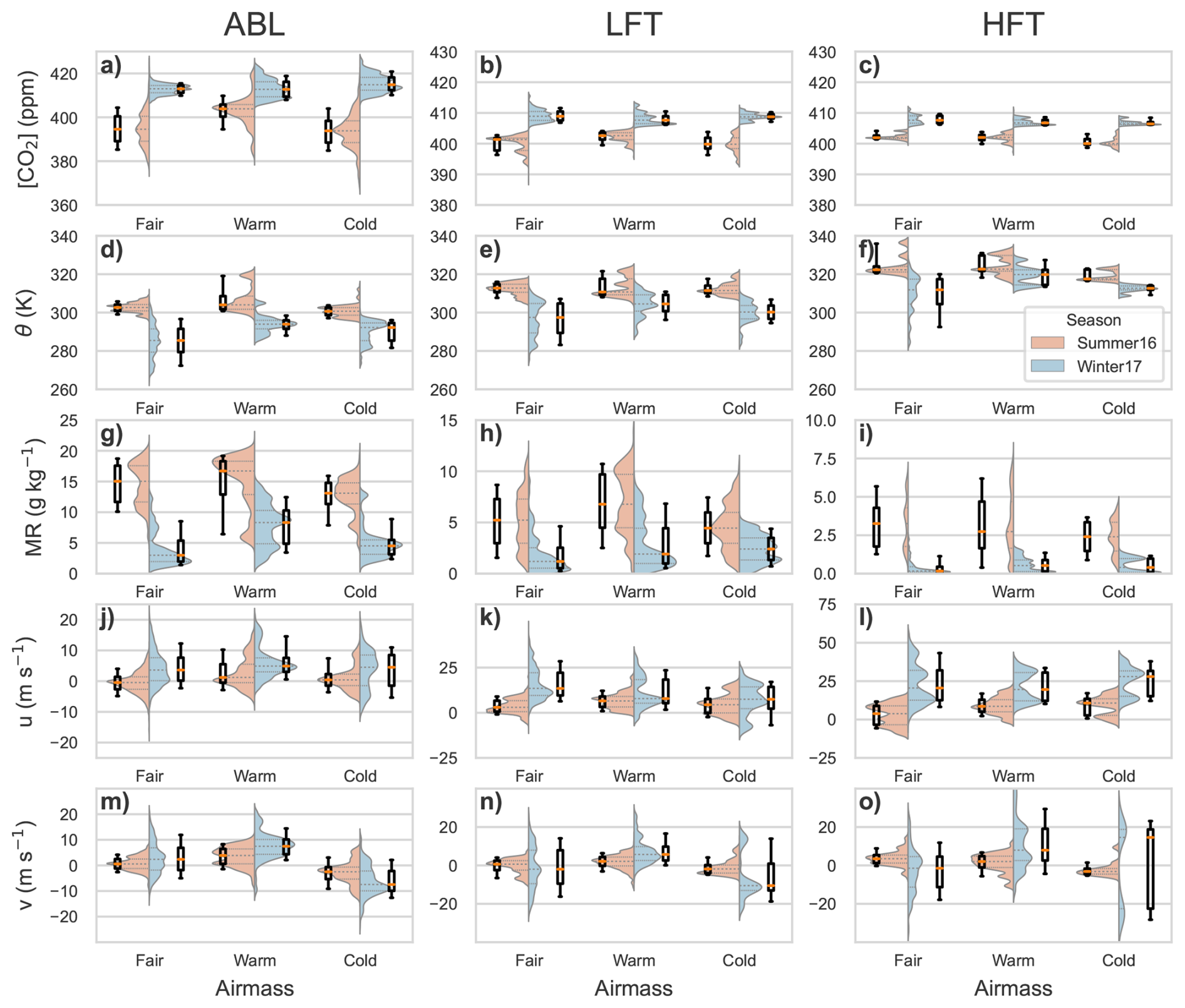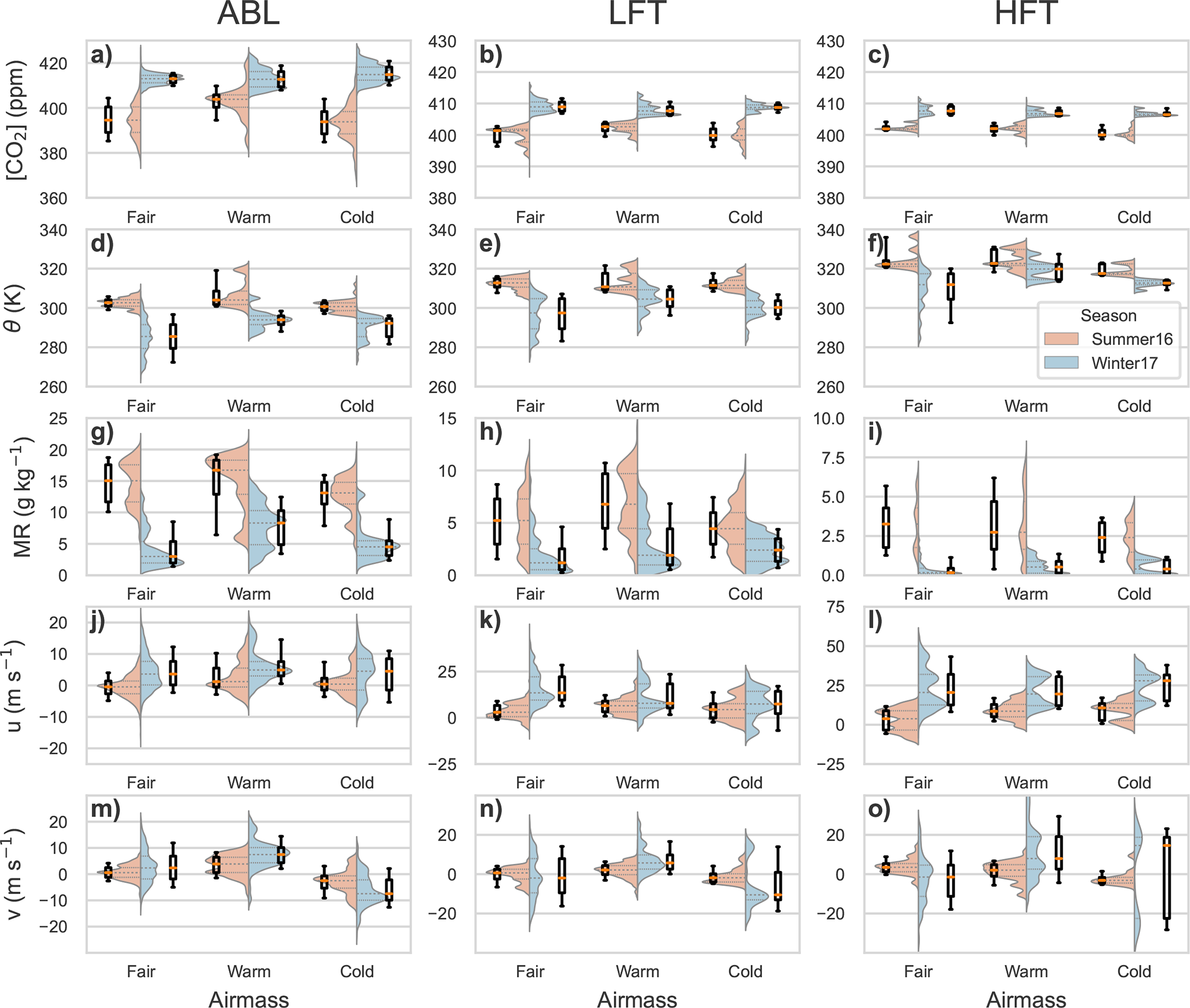 To provide context for interpreting PRIM results,an overview of observed atmospheric conditions during the ACT Summer 2016 and Winter 2017 campaigns is shown in Fig. 2. In line with expectations, [CO2] is generally lower in summer due to biospheric uptake, while θ and MR are higher in summer than winter. Median u-wind velocities are larger during the winter campaign and generally indicate westerly winds. For v-winds, fair weather and warm sectors tend to be associated with southerly flow in ABL and LFT, while cold sectors tend to exhibit northerly flow. For HFT, there is no clear relationship between airmass and meridonal wind. [CO2] and MR variability is larger during summer compared to winter, while θ, u- and v-wind exhibit more variability in winter than summer. There is notably a much larger variation of MR in the free troposphere (LFT & HFT) during summer compared to winter that is potentially attributable not only to temperature, but also to convective massflux.