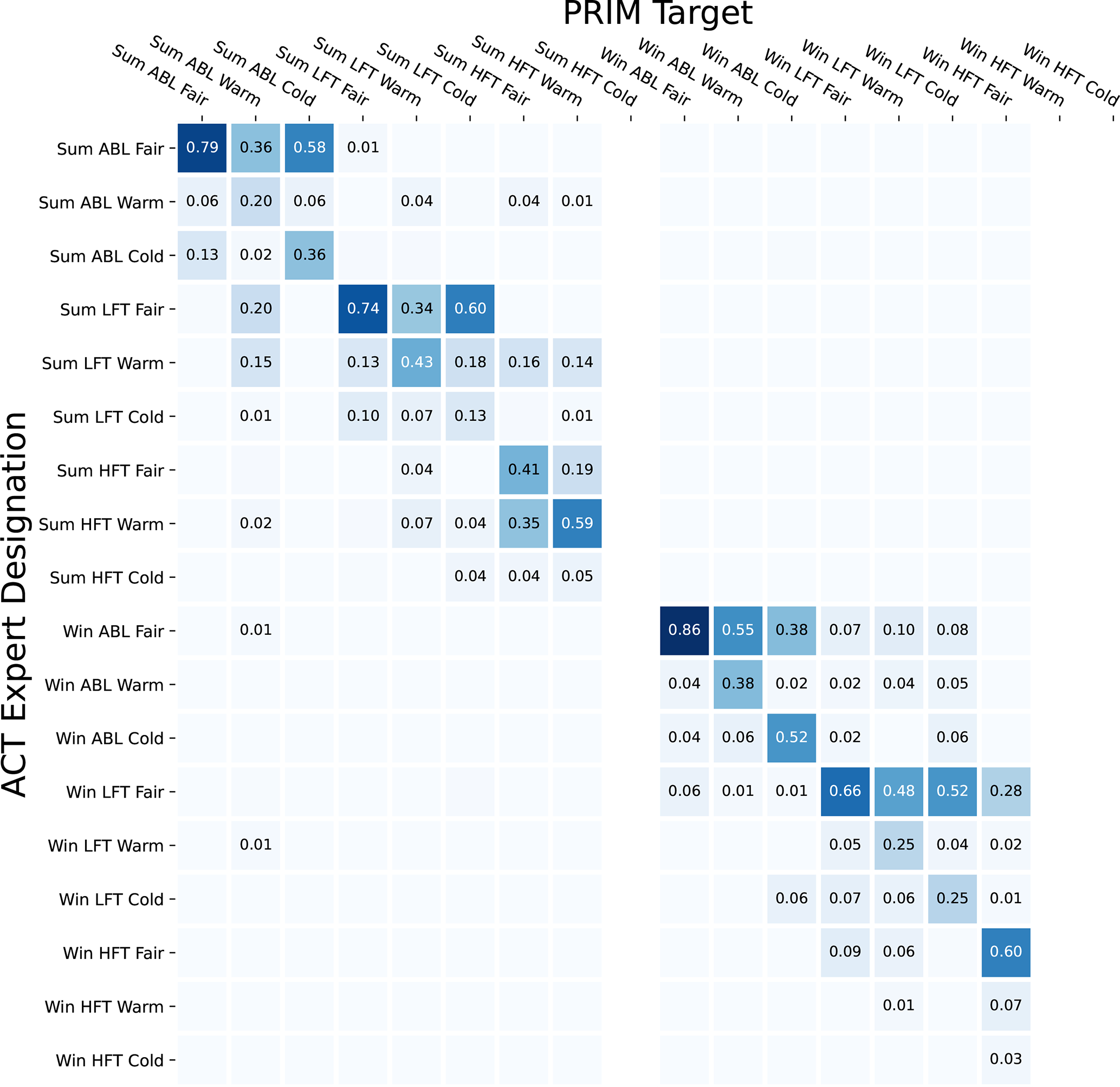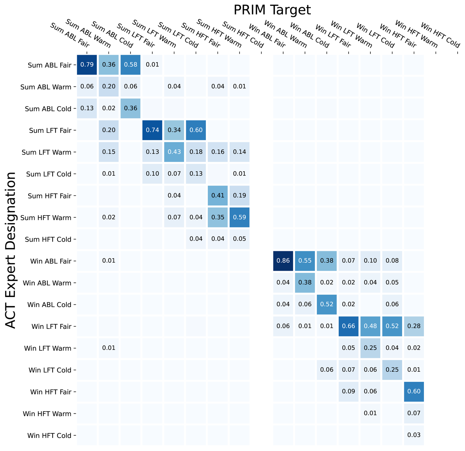 Figure 3Comparison of PRIM target-designation and actual pre-designated ACT-Classification by experts within the parameter space identified by the PRIM box. Values on the diagonal show the fraction of target observations (i.e. the density) for each class within the parameter space designated by PRIM at the chosen coverage of 0.75, while the remainder of each column shows the occurrence of observations from other ACT designations within the PRIM box. Values in each column will add to 1.0 and labels for classes with a share of less than 0.01 of observations are omitted for clarity.