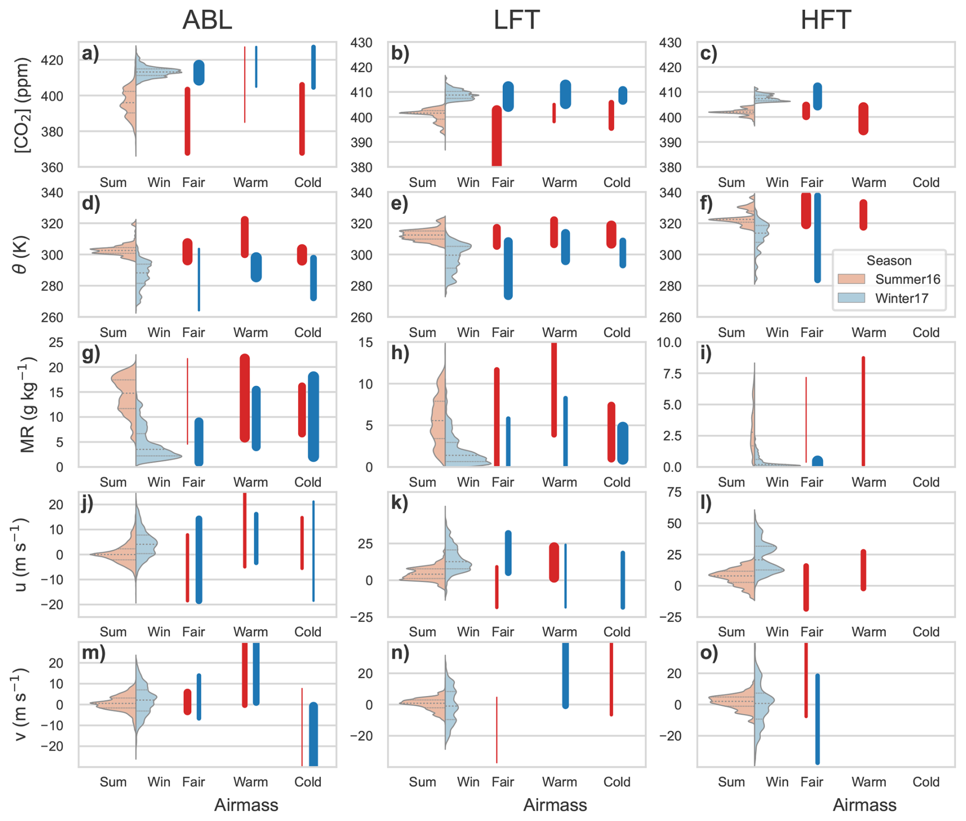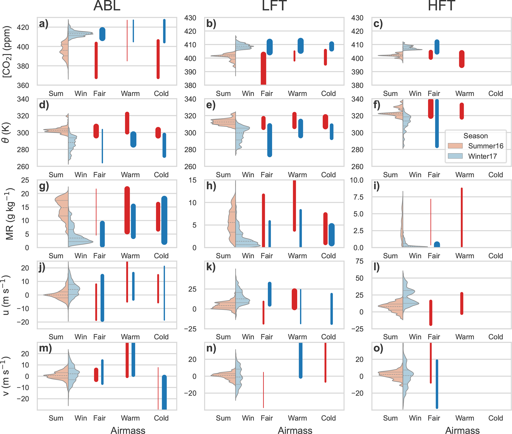Figure 2Kernel density plots of observed atmospheric conditions during ACT Summer 2016 (red) and Winter 2017 (blue) campaigns for (a–c) [CO2], (d–f) potential temperature (θ), (g–i) water vapor mixing ratio (MR), (j–l) zonal wind speed (u), and (m–o) meridional wind speed (v). Data are separated into vertical levels corresponding to atmospheric boundary layer (left column), lower free troposphere (center column) and higher free troposphere (right column) and airmass. Overlaid box-whisker plots show median (orange line), interquartile range (box), as well as 10th and 90th percentiles (whiskers). Interquartile range and median are also shown on the kernel density plots as solid and dashed lines.