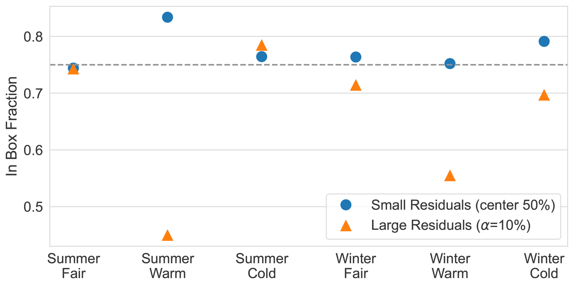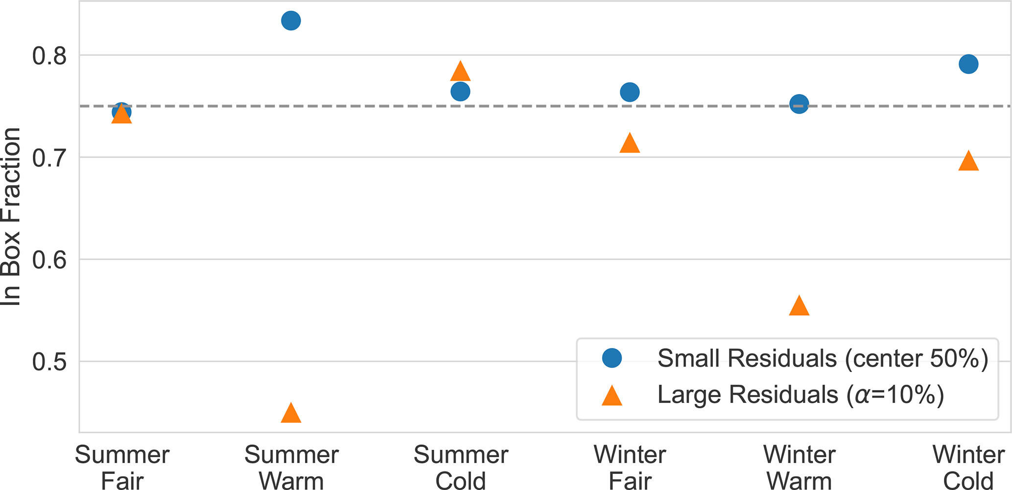 We proceed to define the the center 50 % of [CO2] residuals as small residuals and residuals beyond the 5th and 95th percentiles as large residuals. Comparing the share of small (Fig. 6) confirms the previously observed association of large magnitude [CO2] residuals with conditions outside of typical atmospheric parameter range delineated by the PRIM box.