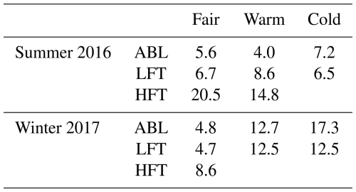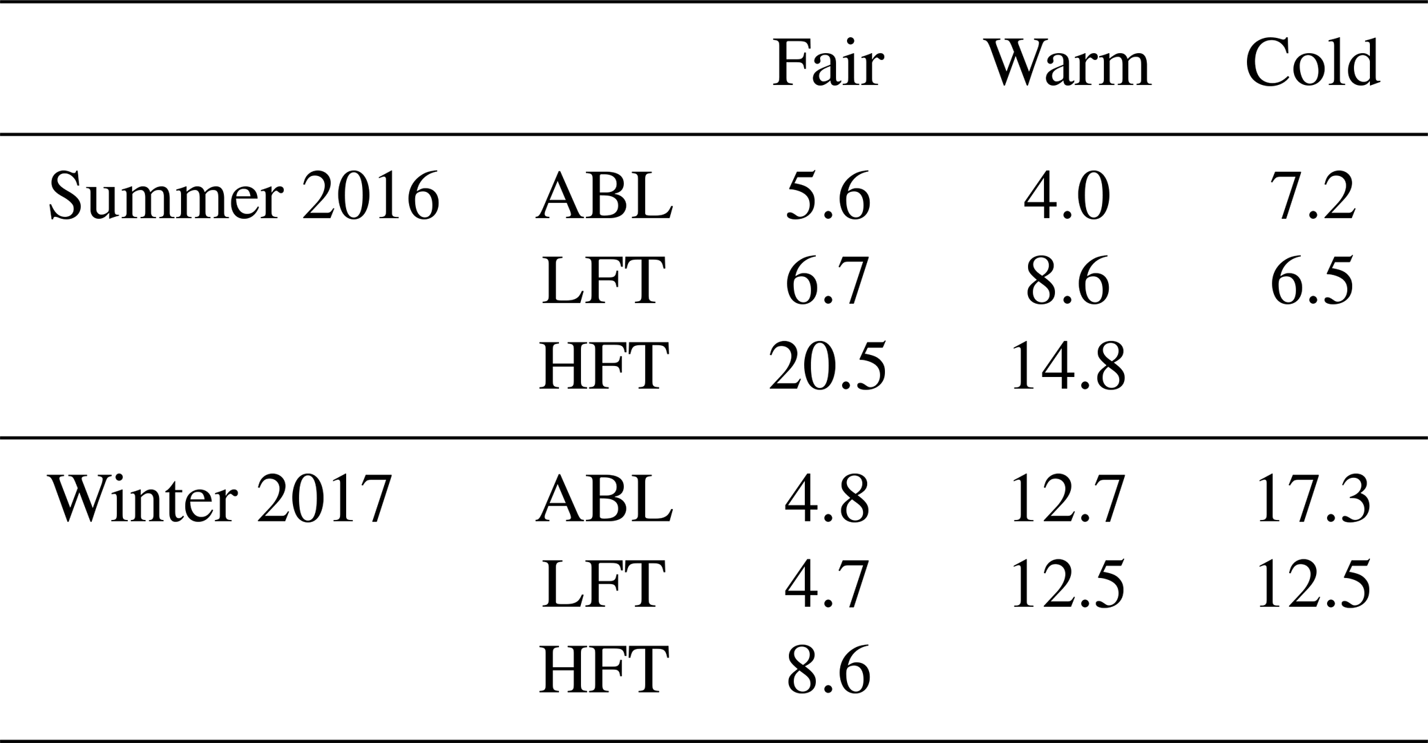 Near-frontal warm and cold sector observations are less well separated by PRIM from fair weather air masses, but warm sector air is rarely found within PRIM designations of cold sector air (and vice-versa). For example, box densities for ABL warm and cold sectors are 0.20 and 0.36 for summer and 0.38 and 0.58, respectively during winter, while box densities for fair weather conditions are much higher at 0.79 and 0.86, respectively. Higher box densities for fair weather conditions can be explained by the fact that there is a larger number of fair weather flight days (14 out of 25 and 15 out of 24 d for Summer 2016 and Winter 2017, respectively) with more elaborate sampling patterns (Davis et al.2021) and thus more observations in the ACT data-set and because there is a substantial overlap in atmospheric conditions between fair weather conditions and near-frontal warm and cold sector air (see Fig. 2, left column). During summer, 36 % of observations within the PRIM box designating ABL warm sector conditions belong to instances with expert-designation of fair weather ABL and another 36 % belong to observations attributed to LFT air (20 % LFT fair and 15 % LFT warm). During winter, 55 % of observations within the PRIM box for ABL warm sector conditions belong to the expert-designation of ABL fair, while only 1 % are pre-classified as free tropospheric.