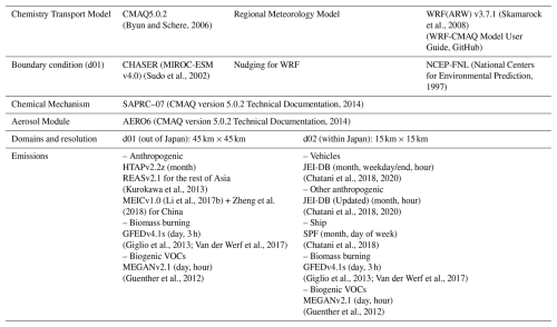 For domain d02 (JPN), anthropogenic emissions were taken from the updated Japan Clean Air Program and Japan Auto-Oil Program emission inventory database module (updated JEI-DB, Formulation Committee for PM2.5 Emission Inventory and Source Profile, 2019; Japan Petroleum Energy Center, 2017), except for vehicle emissions (2010). Ship emissions ( resolution) were provided by the Sasakawa Peace Foundation and were estimated from activities determined using an automatic identification system, with averaging performed on an hourly and daily basis. The JEI-DB and ship emissions data have advanced air quality modelling research in JPN (Chatani et al., 2018, 2023; Li et al., 2017b; Kurokawa et al., 2013; Shibata and Morikawa, 2021). Biogenic VOC emissions were derived from the Model of Emissions of Gases and Aerosols from Nature (MEGANv2.1) for both domains as hourly data (Guenther et al., 2012). The d01 simulation period covered 3 years (2016–2018).