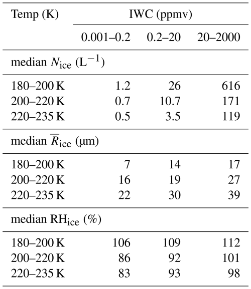 Table 3Cirrus median Nice, and RHice∗ in nine IWC-T (Ice Water Content – Temperature) intervals, calculated from the combination of all flights shown in Krämer et al. (2020) (their Fig. 6) within the respective IWC and temperature intervals. The variation of the 25 % and 75 %-percentiles around the medians is between −20 % and +180 % for Nice, −10 % and +40 % for and −5 % and +20 % for RHice.