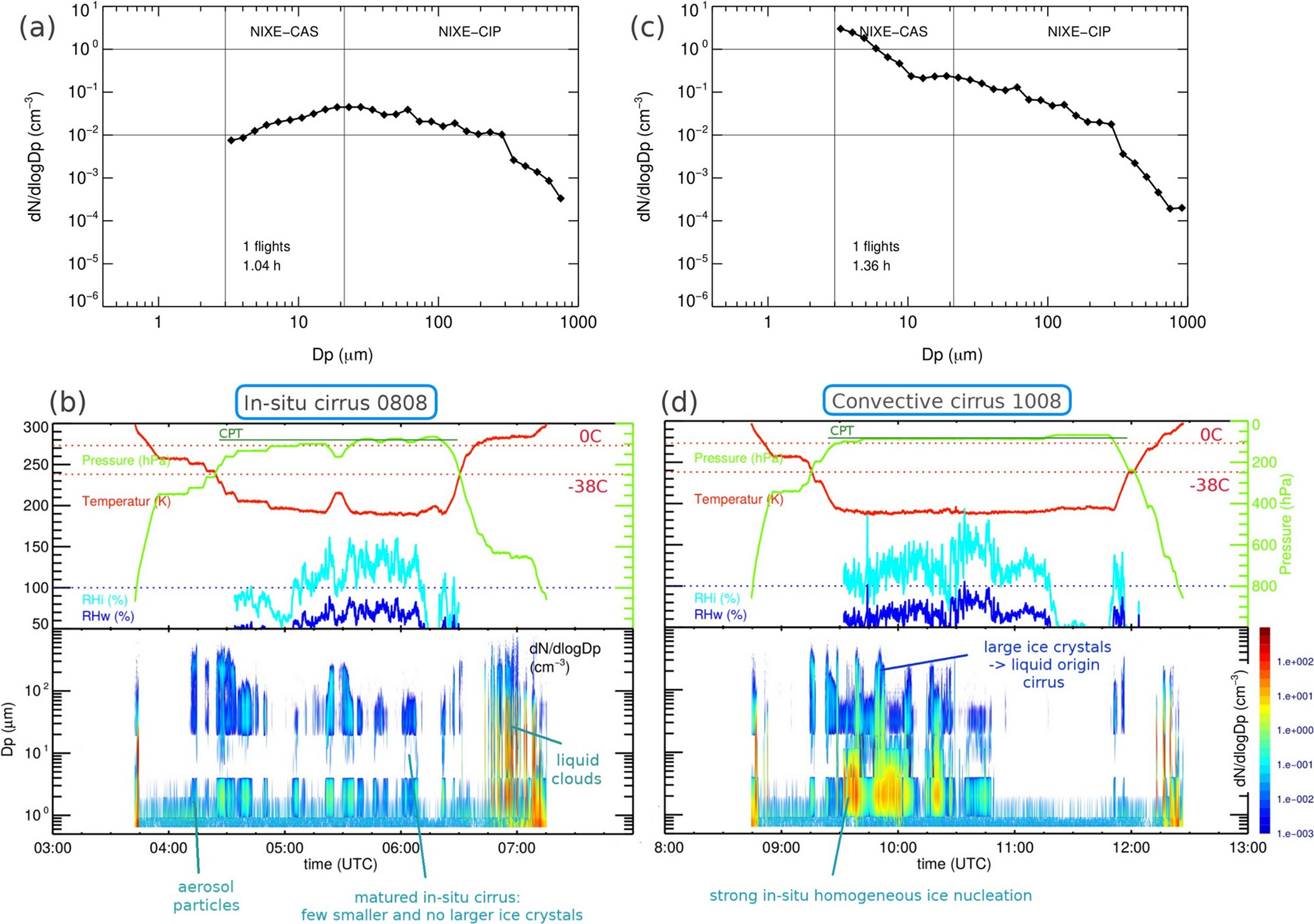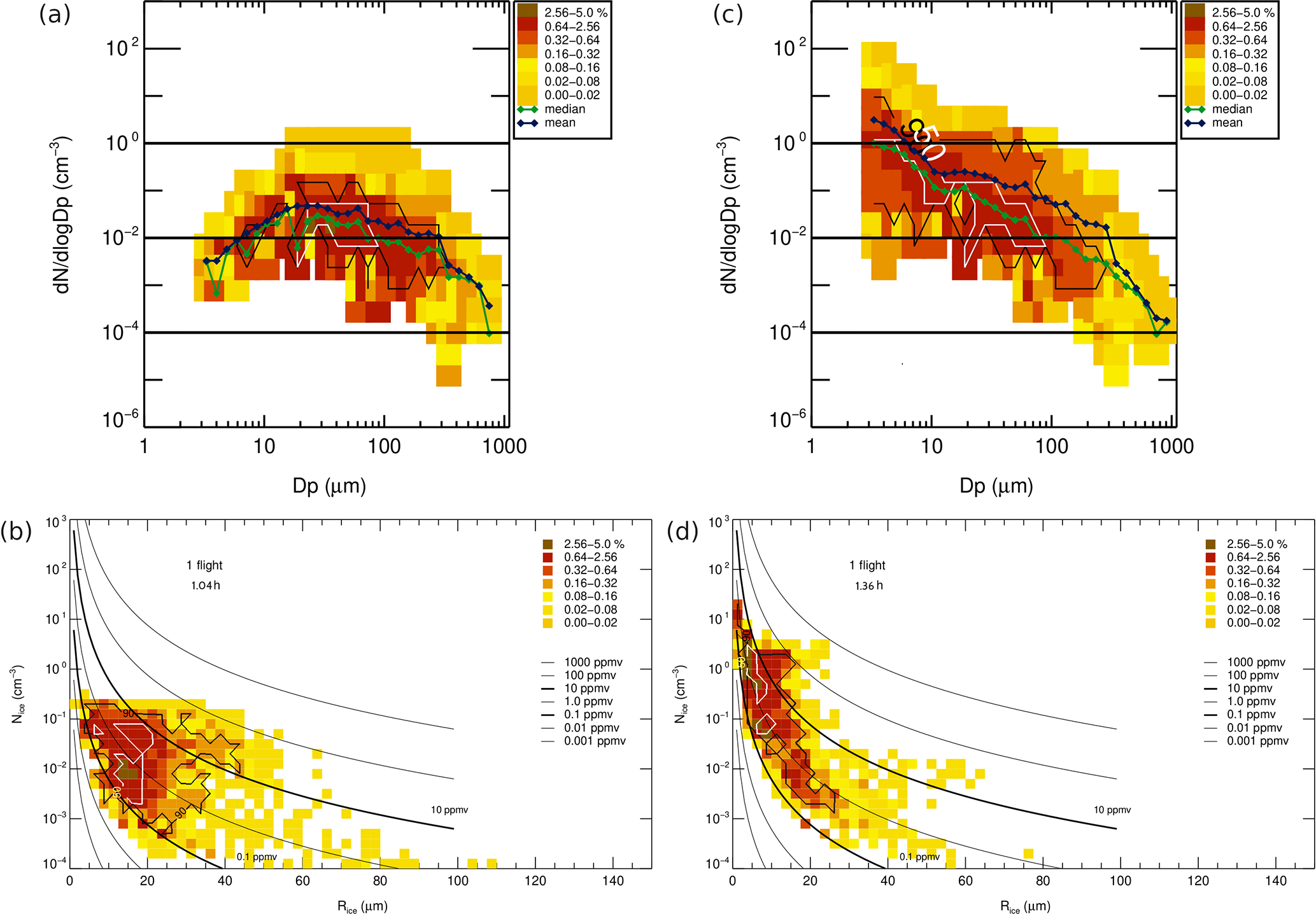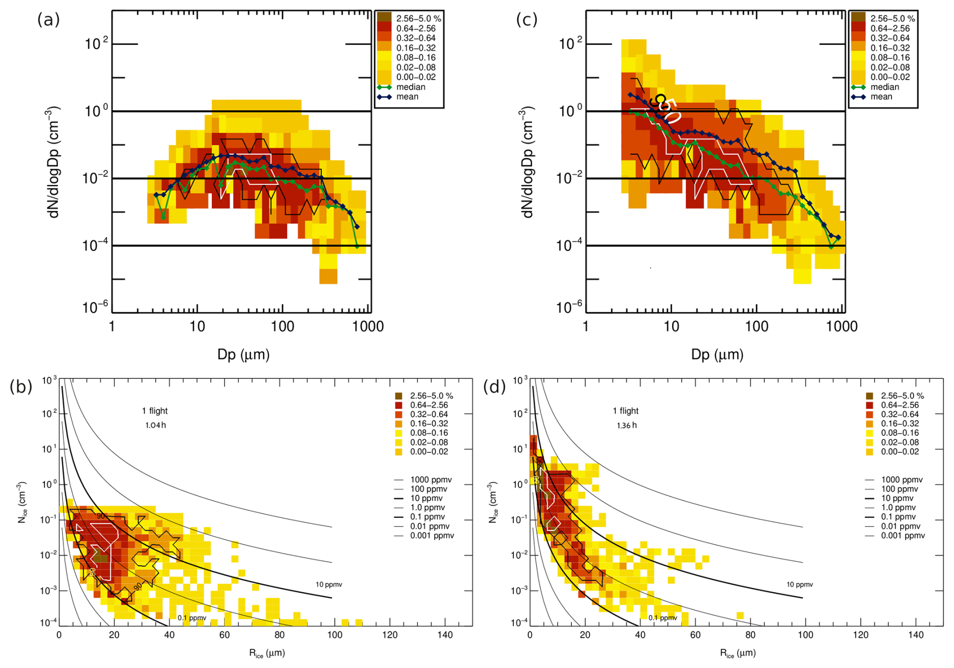 Figure 1Cirrus PSDs: (a, c) mean PSDs, (b, d) PSDS along aircraft flights, for two flights during the StratoClim campaign in 2017 out of Nepal. (Dp > 3 µm is Dice.)