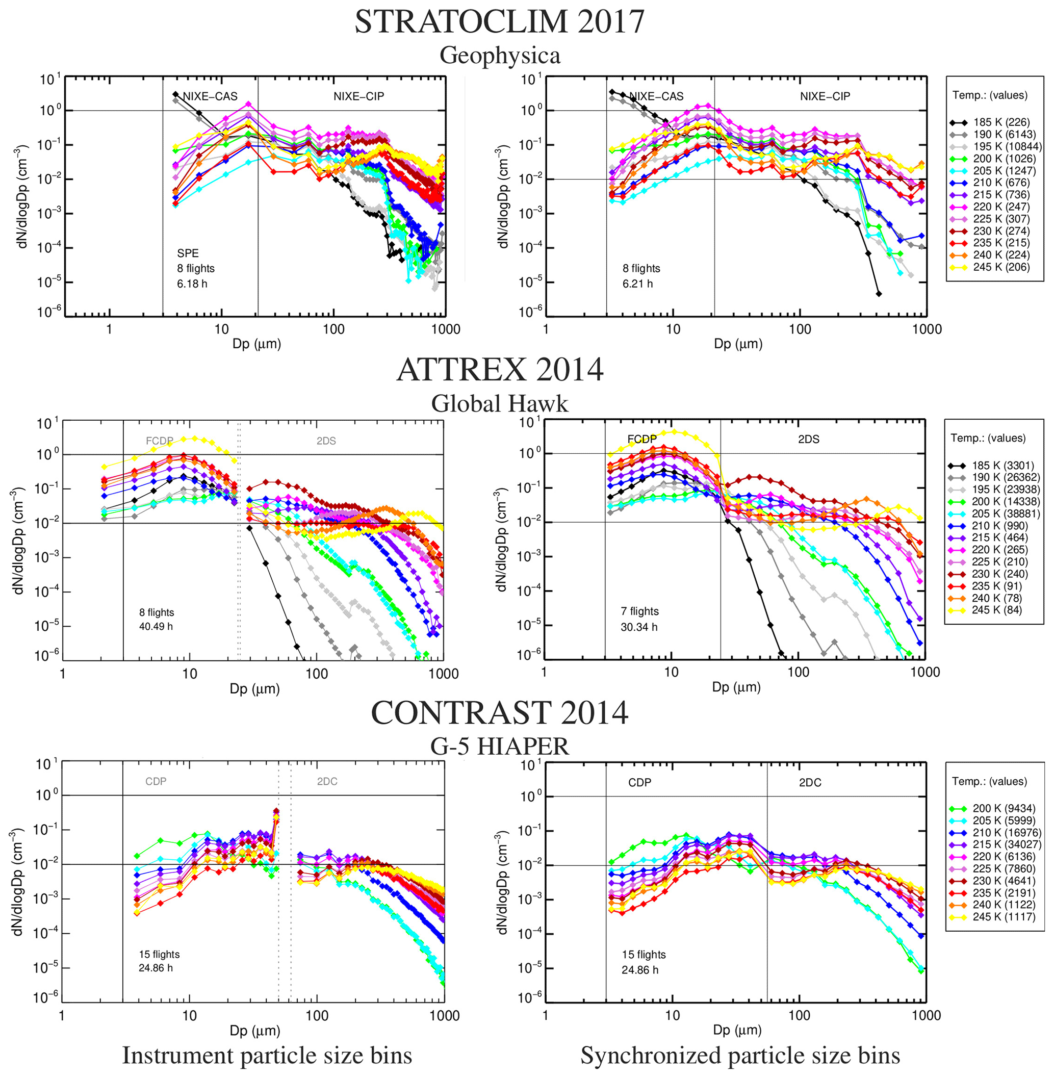 Figure 5Cloud particle size distributions in 5 K temperature intervals from three field campaigns with different aircraft and different pairs of instruments: NIXE-CAPS (StratoClim; CAS-depol+CIPgs), FCDP+2D-S (ATTREX) and CDP+2D-C (CONTRAST; note that the CDP outliers at 50 µm are filtered out); the size of the particles from the optical array probes (CIPgs, 2D-S, 2D-C) is maximum dimension. Left column: original irregular size grid of the instruments; right column: synchronized logarithmic equidistant size grid. Note that the transition between each respective pair of instruments is smooth, indicating no systematic errors in the measurements of the individual instruments.