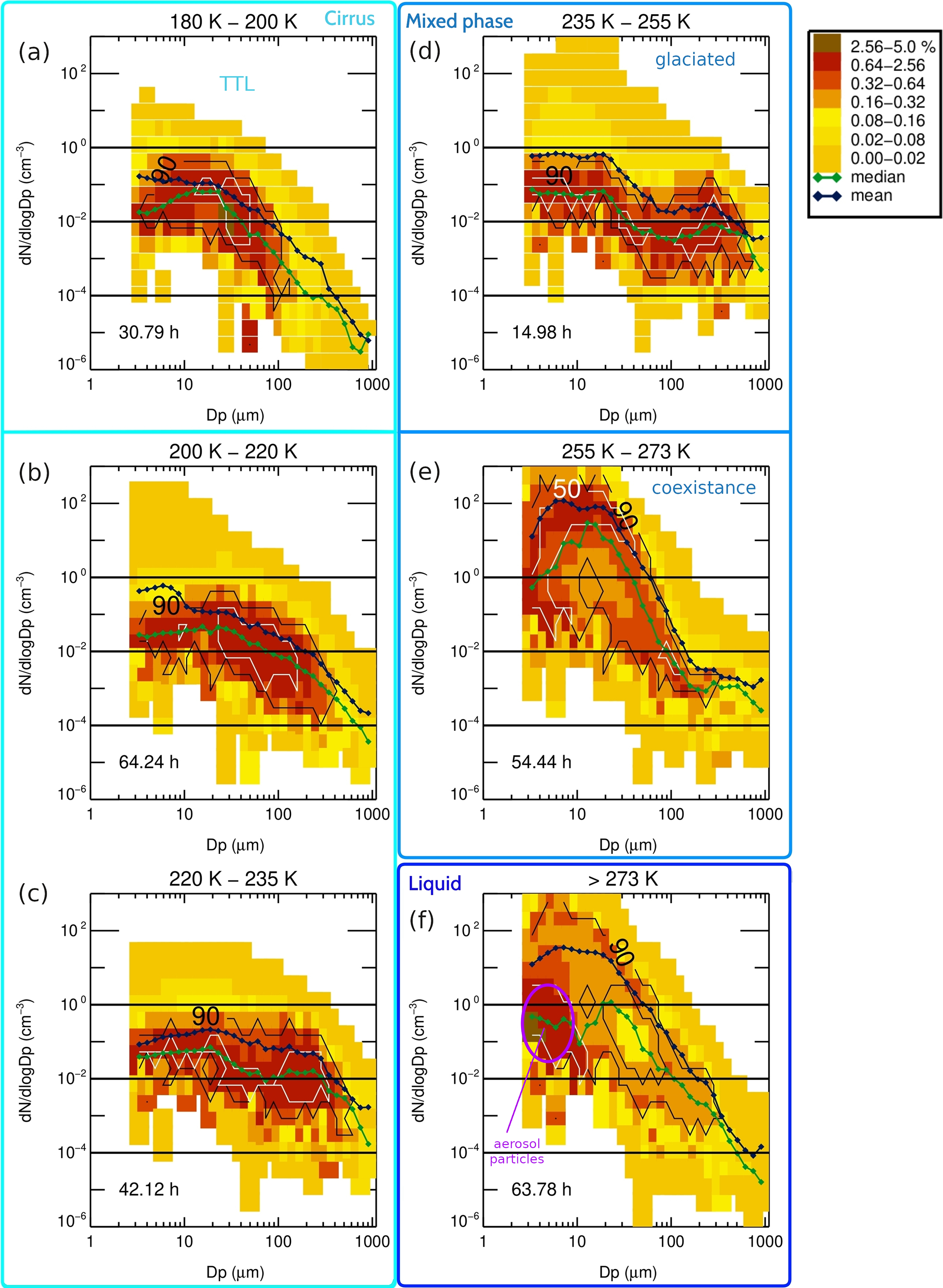 Cloud PSD heat maps of cirrus, mixed-phase and liquid clouds are displayed in variuos temperature ranges to provide an overview of the most common cloud particle sizes and concentrations contained in the PSD datasets. Figure 6 shows the heat maps for cirrus (Fig. 6a–c), mixed-phase (Fig. 6d–e) and liquid clouds (Fig. 6f) in their respective temperature ranges, namely cirrus clouds between 180–235 K (∼ −90 to −38 °C), mixed-phase clouds in the range 235–273 K (−38 to 0 °C) and liquid clouds for temperatures > 273 K (> 0 °C). The mixed-phase and cirrus clouds are divided into sub-ranges, with the coldest temperature range representing measurements in the tropical tropopause layer (TTL, Fig. 6a).