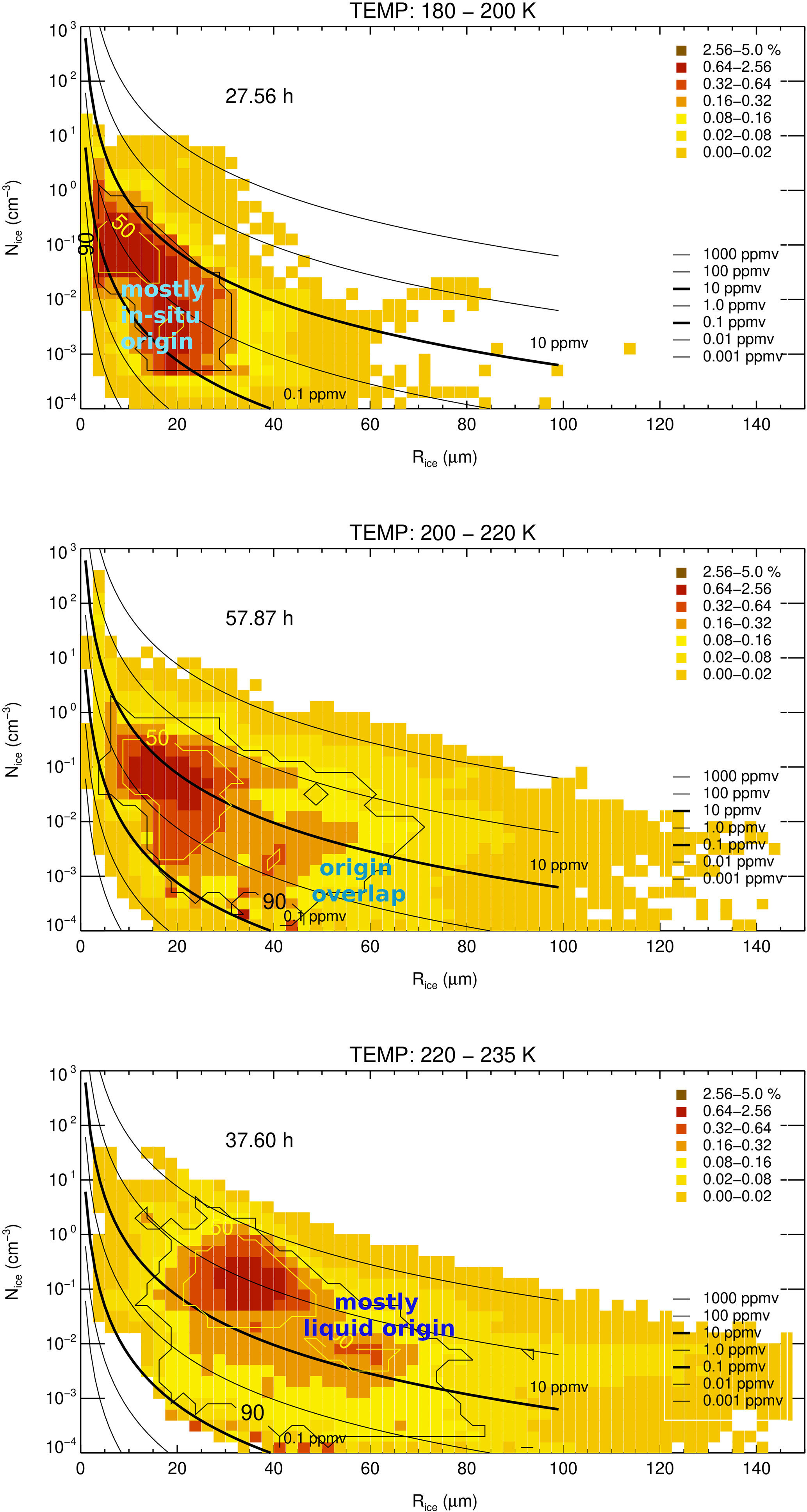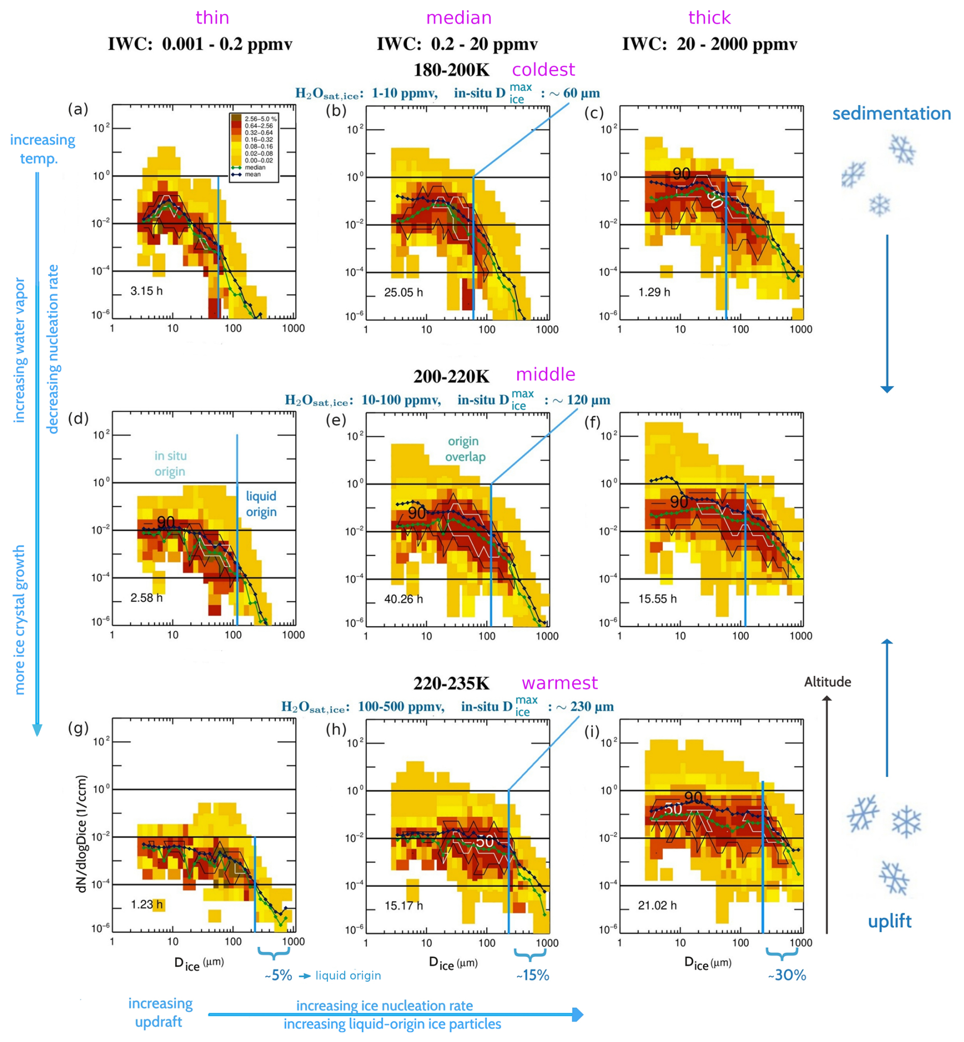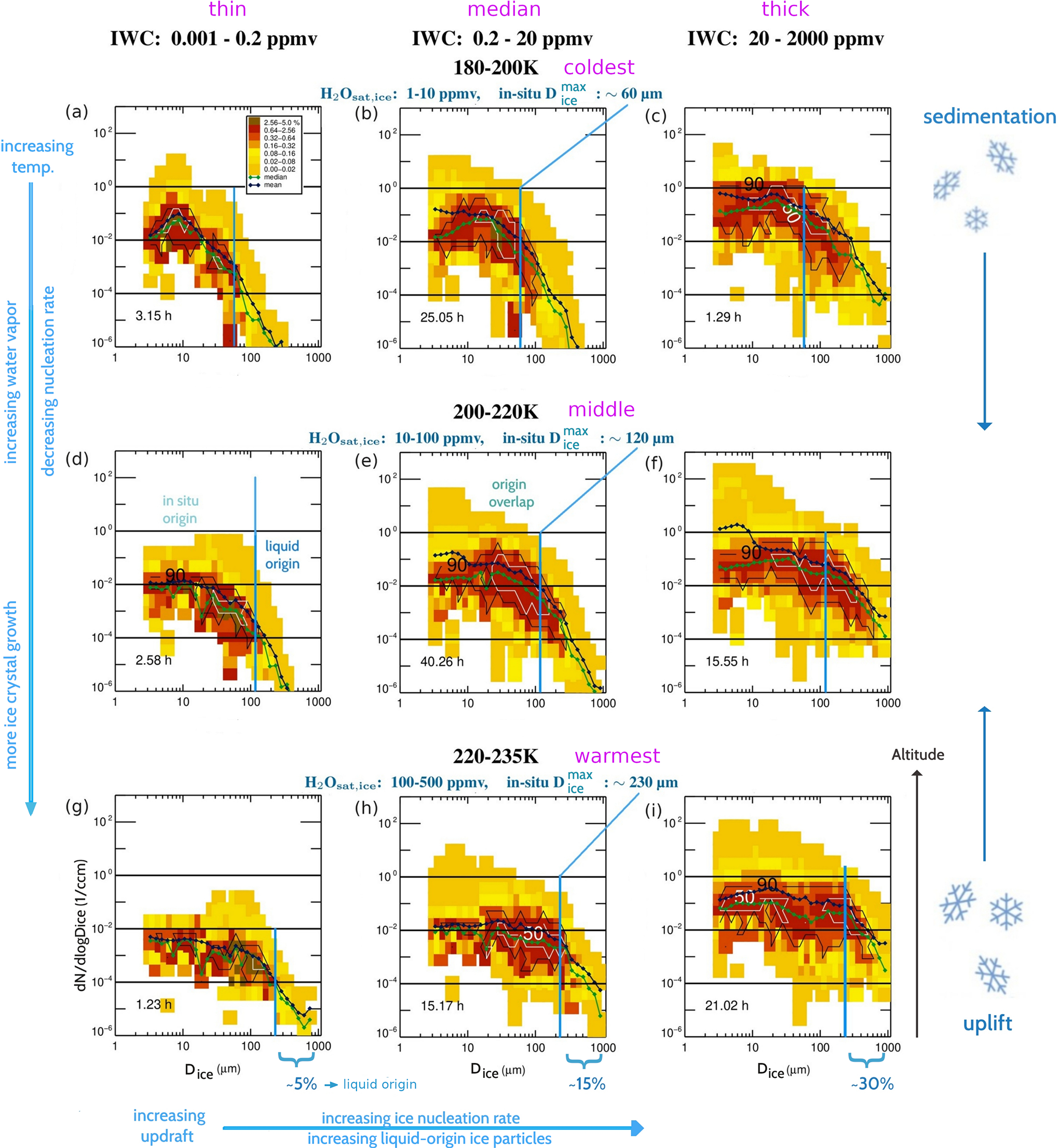 The warmest cirrus (bottom row of Fig. 7g–i) have the broadest ice particle size ranges of all temperature intervals. Due to the highest amount of available water to grow the ice particles (100–500 ppmv), the in situ is largest (∼ 230 µm). Additionally, at ≳ 230 K, in situ-origin ice particles larger than may also occur due to aggregation (see Sect. 2.3.3).