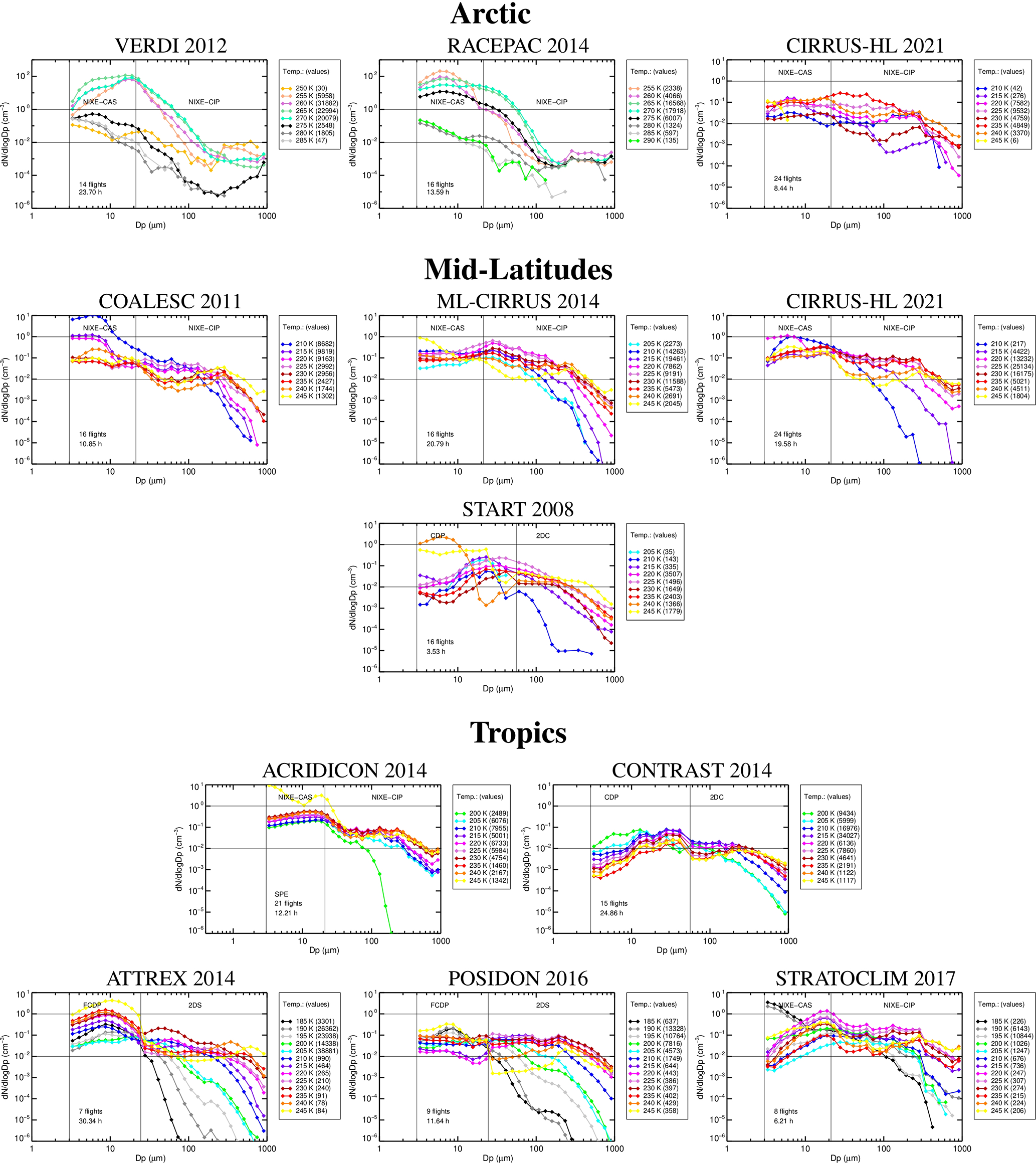 Figure A1Cloud particle size distributions in 5 K temperature intervals for the eleven field campaigns from the JULIA database; the campaigns are grouped by geopgraphical region (note that the measurements during CIRRUS-HL are split into Arctic and mid-latitude); the instruments pairs are noted in the different panels; the size grids are logarithmically equidistantly synchronized.