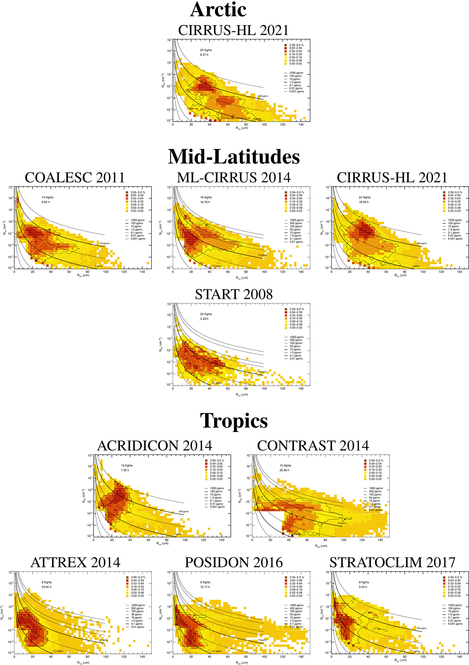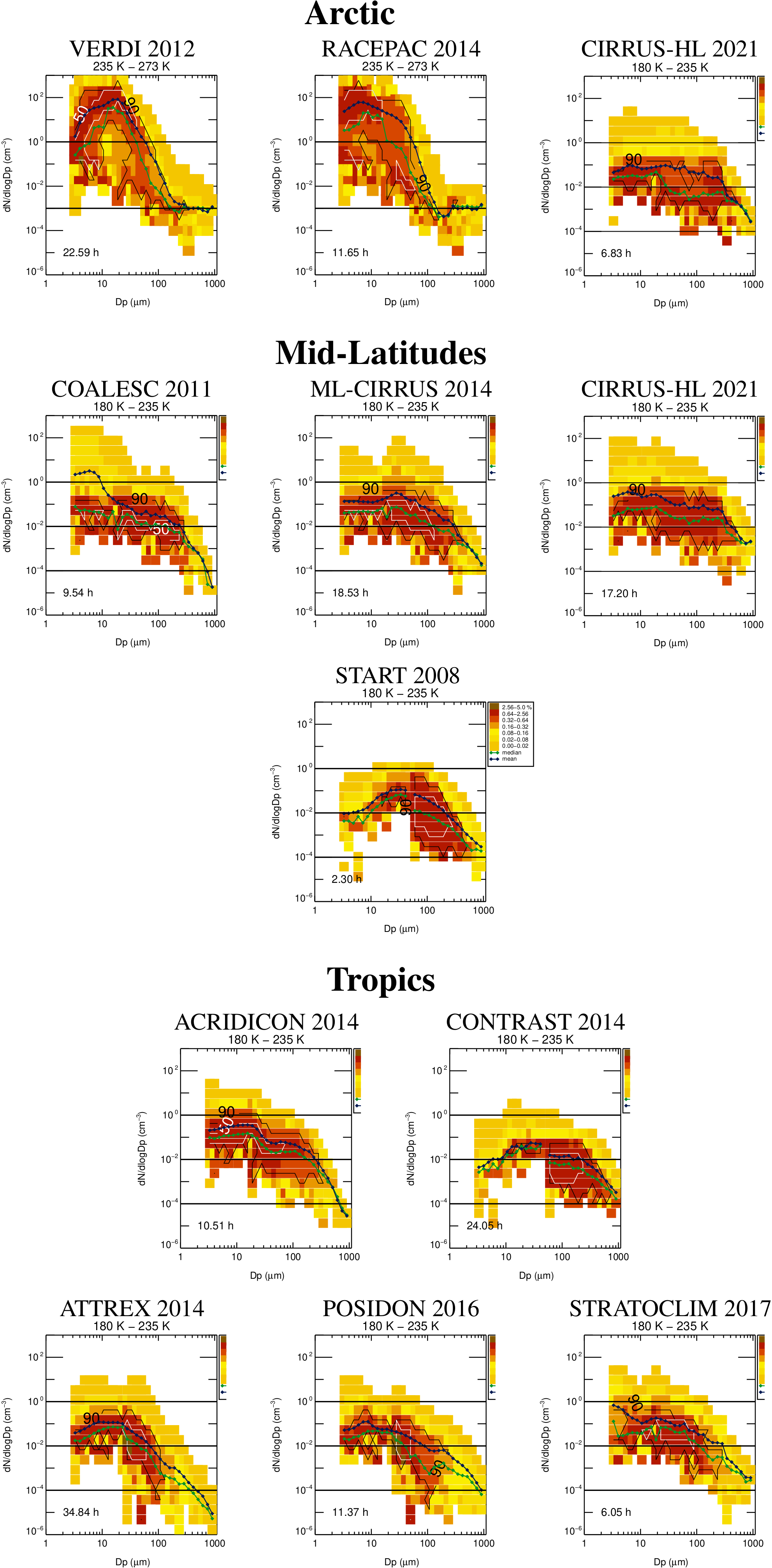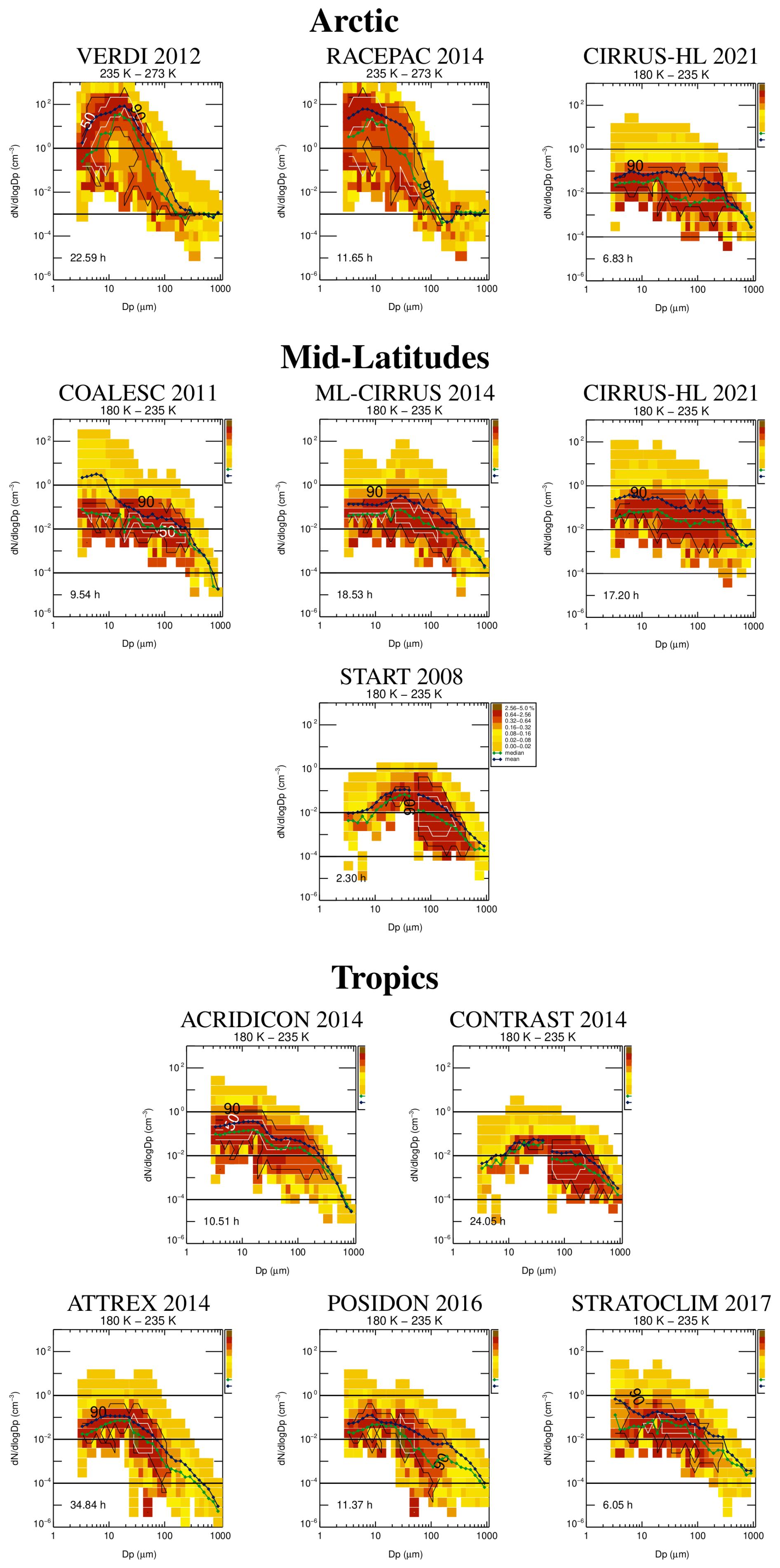 Figure A2Heat maps of cloud particle size distributions for the eleven field campaigns from the JULIA database; the campaigns are grouped by geopgraphical region (note that the measurements during CIRRUS-HL are split into Arctic and mid-latitude).