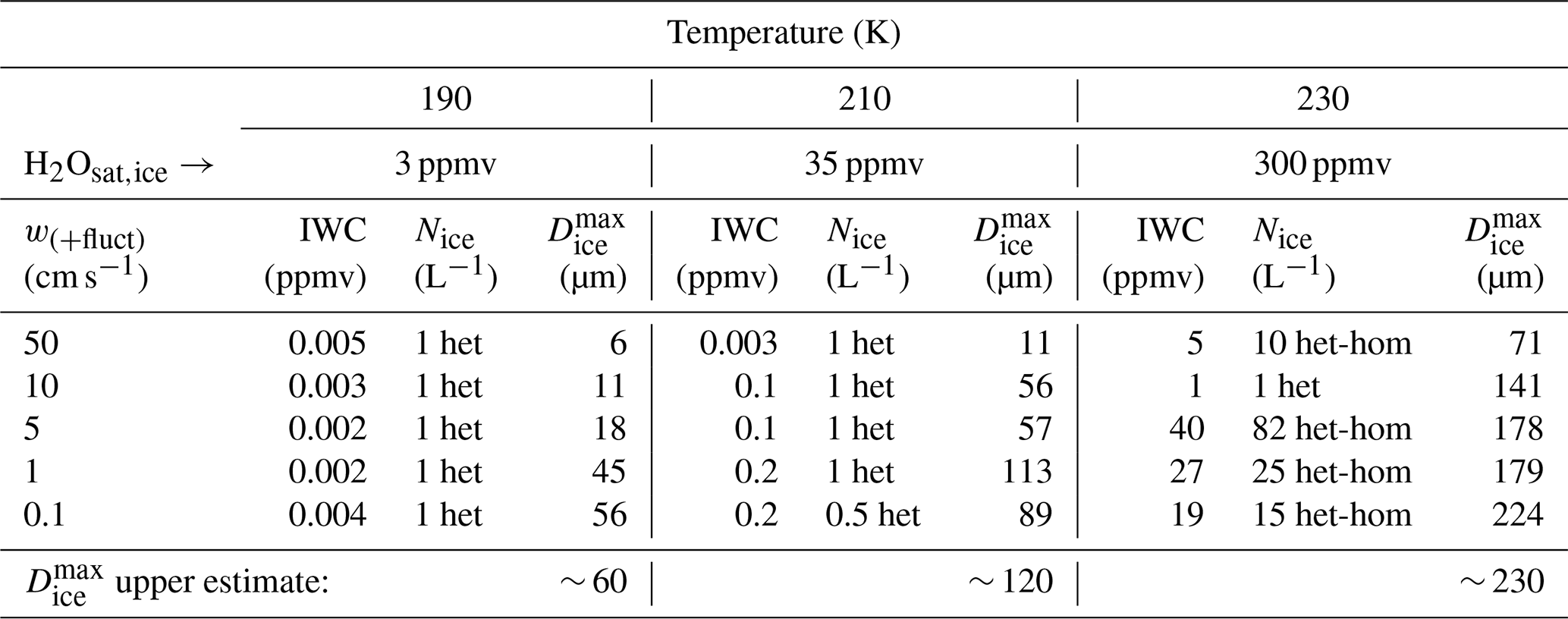 What can be seen from Table 1 is, as expected from the discussion of Fig. 3 in the previous section, that the colder the temperature the thinner are the cirrus in terms of IWC and the smaller are the largest ice particles . At 190 K, is found to be between 5 to 56 µm, which is in good agreement with Jensen et al. (2010). They simulated the evolution of ice PSDs at 190 K in weak updrafts for a time period of ∼ 3.5 h and found maximum sizes of ∼ 15 µm in slight supersaturations. It is to note that at the coldest temperatures the largest possible ice crystals appear via heterogeneous ice nucleation (het) at low concentrations of INPs. Homogeneous freezing, that occur in all simulations after the initial heterogenous freezing event, produces ice crystals with smaller sizes, mostly due to a higher Nice on which the water vapor distributes.