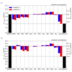 We calculate the contribution of each category to the CH4 lifetime change with respect to total OH using the two methods, which are explained in Sect. 2.4. The results are shown by the blue and red bars, respectively, in Fig. 8. The relative contributions are consistent for both methods. However, method 1 indicates overall less pronounced CH4 lifetime changes for the individual categories and underestimates the CH4 lifetime change with respect to total OH. The sum of all individual contributions calculated using method 2 reproduces the CH4 lifetime change with respect to total OH well in the NH and slightly overestimates it in the SH.